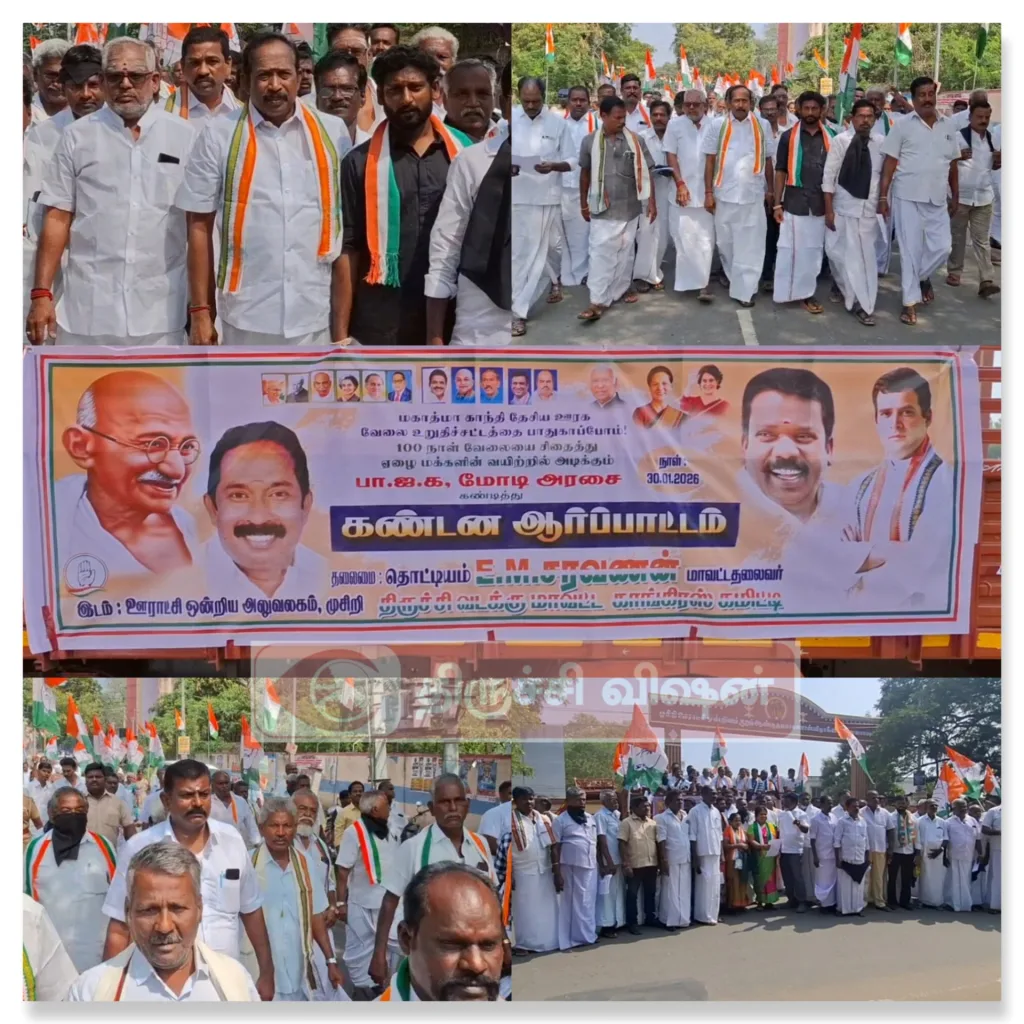 திருச்சி மாவட்டம், முசிறி ஊராட்சி ஒன்றிய அலுவலகம் முன்பாக இந்திய தேசிய காங்கிரஸ் கமிட்டி திருச்சி வடக்கு மாவட்ட சார்பில், மத்திய அரசு மகாத்மா காந்தி தேசிய ஊரக வேலைதிட்டத்தின் பெயரை மாறுதல் செய்து மாநில அரசுகளுக்கான நிதியை குறைத்ததை கண்டித்து கண்டன ஆர்ப்பாட்டம் திருச்சி வடக்கு மாவட்ட தலைவர் சரவணன் தலைமையில் நடைபெற்றது, ஆர்ப்பாட்டத்தில் நிர்வாகிகள் வாயில் கருப்பு துணி கட்டி மத்திய அரசுக்கு எதிராக முழக்கங்களை எழுப்பினர்,