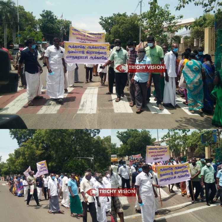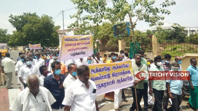 இதன் ஒருபகுதியாக திருச்சி நவல்பட்டு கிராம மக்கள் 100 மேற்பட்டோர் திருச்சி மாவட்ட ஆட்சியர் அலுவலகம் முன்பு மனு அளிக்க திரண்டனர். பின்னர் கோரிக்கை மனுவுடன் தங்களது ஊராட்சியை மாநகராட்சியுடன் இணைப்பதற்கு எதிர்ப்பு தெரிவித்து கண்டன கோஷங்களை எழுப்பினர்.