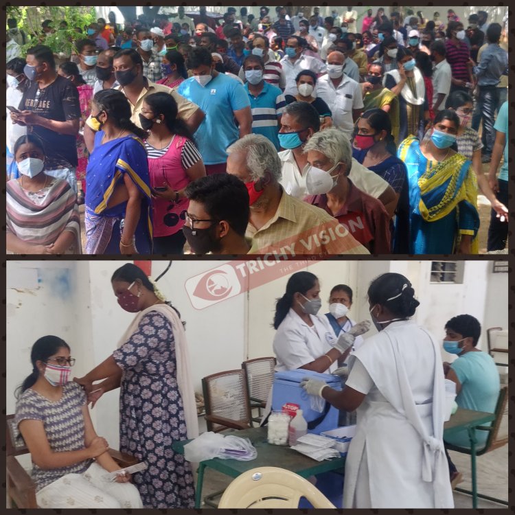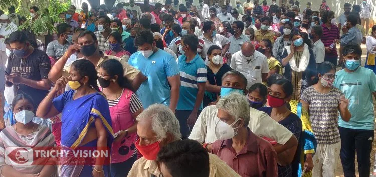 மீண்டும் இரண்டு நாட்களுக்கு பிறகு இன்று(29.06.2021) திருச்சி மாநகர் மற்றும் மாவட்ட பகுதியில் குறைந்த அளவு வந்த 7400 கோவிசீல்டு தடுப்பூசிகளை செலுத்துவதற்கு மையங்களில் ஏராளமான பொதுமக்கள் நீண்ட நேரம் வரிசையில் காத்திருந்து போட்டுக் கொள்ள வேண்டிய நிலைக்கு தள்ளப்பட்டனர்.