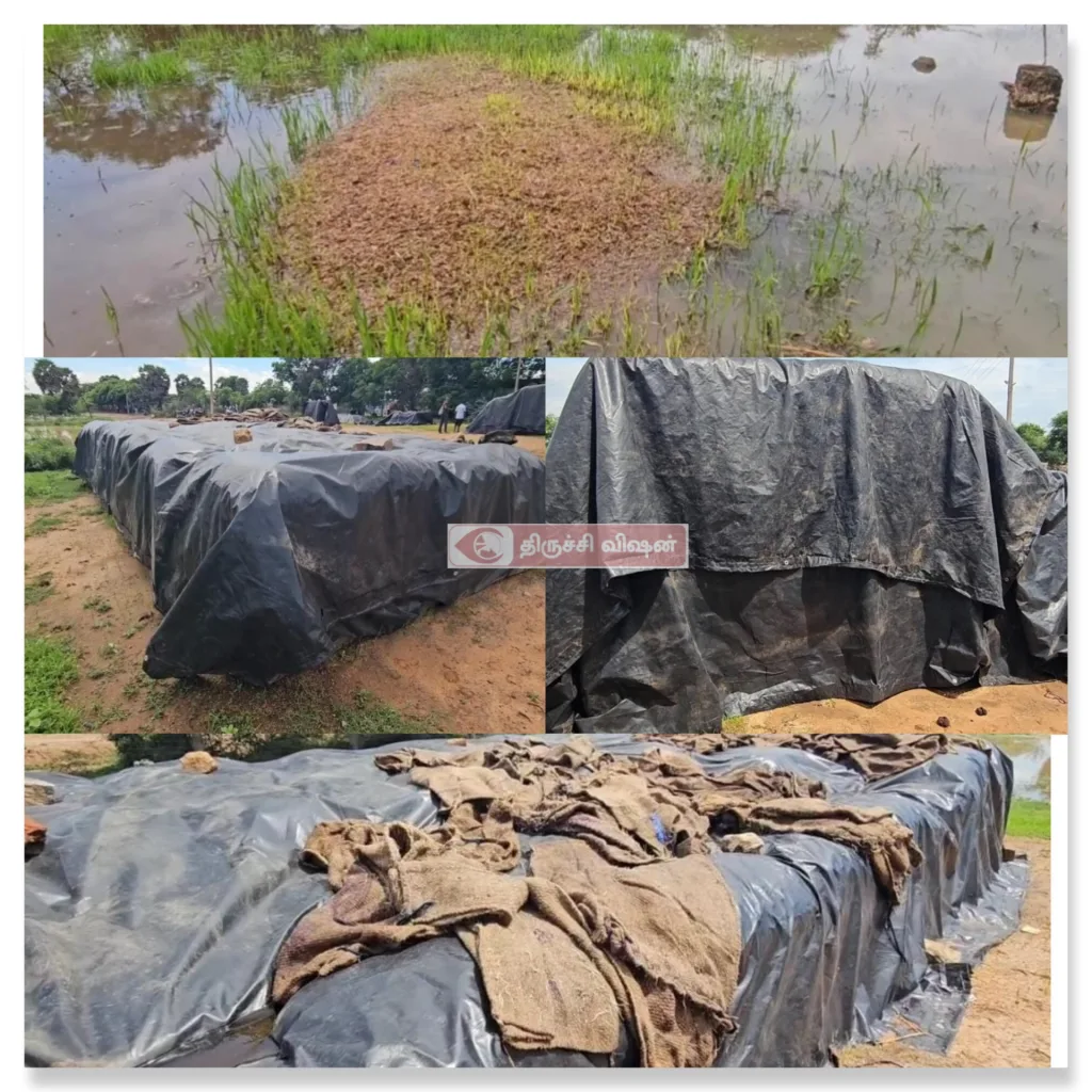 திருவெறும்பூர் அருகே உள்ள பத்தலபேட்டை ஊராட்சியில் உள்ள விவசாயிகள் பயன்பெறும் வகையில் அவர்களின் சிரமத்தை போக்கும் வகையில் தமிழக அரசின் நெல் கொள்முதல் நிலையம் அமைத்து 2019 ஆம் ஆண்டு அமைக்கப்பட்டு இயங்கி வருகிறது இந்த நெல் கொள்முதல் நிலையம் மூலமாக பத்தலபேட்டை ஊராட்சி மற்றும் திருநெடுங்கலம் ஊராட்சியை சேர்ந்த மேல மங்காவனம் கீழ மங்காவனம் தேவராயநேரி ஆகிய கிராம மக்கள் சுமார் 3000 ஏக்கர் பரப்பளவுக்கு மேல் உள்ள விவசாய நிலங்களில் பயிரிடப்படும் நெற்களை இந்த நெல் கொள்முதல் நிலையத்தில் தான் தாங்கள் வயல் பகுதியில் இருந்து டிராக்டர் மூலம் கொண்டு வந்து இறக்குகின்றனர்  இந்நிலையில் இந்த அரசு நெல் கொள்முதல் நிலையத்தில் சம்பா சித்திரை  கார் ஜூன் குருவை என மூன்று போகமாக இங்கு நெற்பயிர்கள் கொள்முதல் செய்யப்பட்டு வருகிறது இந்நிலையில் கடந்த நான்கு நாட்களாக பெய்த கன மழையில் நெல் கொள்முதல் நிலையம் முழுவதும் நீர் சூழ்ந்தும் மேலும்  விவசாயிகள் கொண்டு வரும் நெல்  முட்டைகளை பாதுகாப்புக்காக போதிய வசதி இல்லாததால் நெல் முட்டைகள் பிடிக்கப்படாமல் மலையில் நனைந்து முளைக்கட்டும் அபாயம் ஏற்பட்டுள்ளது மேலும் இப்பகுதி கிராம விவசாயிகள் கூறுகையில் நடவு கூலி அதிகரித்துள்ள நிலையில் உர விலையும் உச்சத்தில் உள்ள நிலையில் விவசாயிகள் நாங்கள் நெல் கொள்முதல் செய்யப்படவில்லை என்றால் என்ன செய்ய முடியும் என்றும் எனவே தமிழக அரசு இதற்கு உரிய நடவடிக்கை எடுக்க வேண்டும் என்றும் மேலும் நடிகர்சங்கத்திற்கு 100 கோடி ரூபாய் ஒதுகும் தமிழக அரசாங்கம் விவசாயிகளுக்கு வாழ்வாதாரமாக இருக்கும் விவசாயத்திற்கு ஏற்ற நெல் குழுமுதல் நிலையங்களுக்கு செலவழிக்க  நிதி ஒதுக்கினால் விவசாயிகளில் வாழ்வாதாரம் காப்பாற்றப்படும் என்று  விவசாயிகள் கோரிக்கை வைக்கின்றனர்.