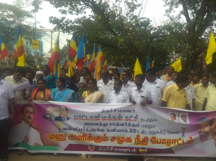 திருச்சி மாநகர் மாவட்டம் பாட்டாளி மக்கள் கட்சி சார்பில் அனைத்து சாதியினருக்கும் மற்றும் வன்னியர்களுக்கு 20% தனி இட ஒதுக்கீடு வழங்க வலியுறுத்தி மாநில துணைப் பொதுச் செயலாளர் ஸ்ரீதர் தலைமையில் மாநகராட்சி ஆணையரிடம் பேரணியாகச் சென்று மனு கொடுத்தனர்.