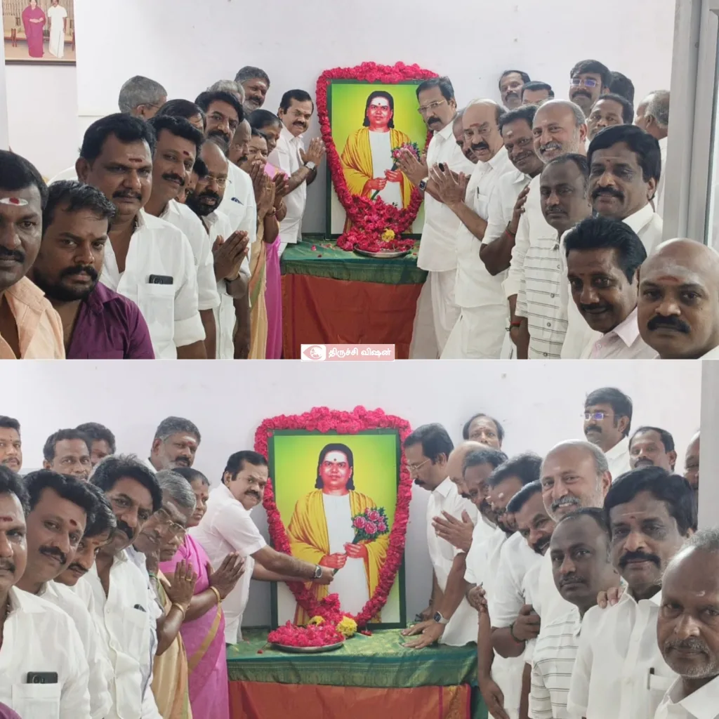 திருச்சி தில்லைநகரில் உள்ள புறநகர் வடக்கு மாவட்ட கழக அலுவலகத்தில் பசும்பொன் முத்துராமலிங்க தேவரின் 118- வது ஜெயந்தி விழாவை முன்னிட்டு அவரது திருவுருவ படத்திற்கு மாவட்ட கழக செயலாளரும், முன்னாள் அமைச்சருமான மு.பரஞ்ஜோதி தலைமையில் கழக நிர்வாகிகள் மாலை அணிவித்து மலர் தூவி மரியாதை செலுத்தினார்.