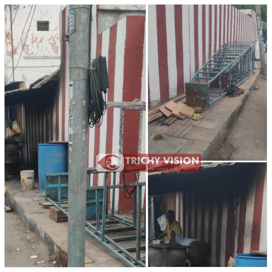 மேலும் தென்னூர் விஸ்வநாதபுரம் சிவன் கோவில் பின்புறம் உள்ள சாக்கடையை ஆக்கிரமித்து ஒரு டிபன் கடை கட்டப்பட்டதுடன் பாதசாரிகள் நடைபாதையும் ஆக்கிரமித்து கடைகள் போடப்பட்டு உள்ளது. இந்த கடை அடுப்பில் இருந்து வெளியேரும் கரும் புகை, கோவில் சுவாமி சிலைகளையும், சுவர்களையும், மண்டபங்களையும் பாழ்படுத்தியும், மழை நீர் செல்லும் சாக்கடை ஆக்கிரமித்து அதன் மேல் கடை கட்டுப்பட்டு உள்ளதால் அருகாமையில் உள்ள பள்ளிக்கூடங்கள் மற்றும் சாலை முழுவதும் நீர் தேங்கி மழைக்காலத்தில் பெரும் சிரமம் ஏற்படுகிறது.