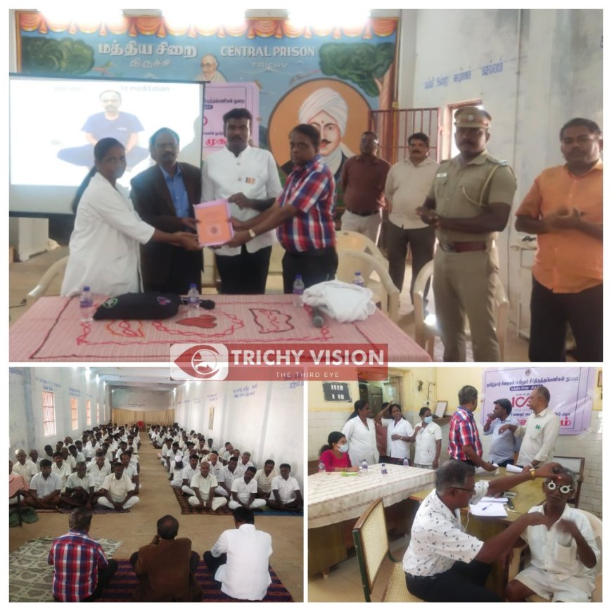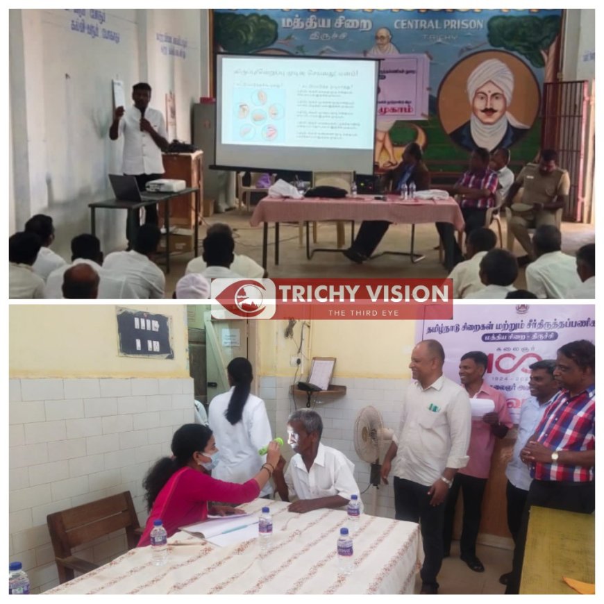 இதனை தொடர்ந்து திருச்சி மத்தியசிறையில் சிறைவாசிகளுக்கான கண் மருத்துவ சிகிச்சை முகாம் நடத்தப்பட்டது. இம்மருத்துவ முகாமை திருச்சி மருத்துவம் மற்றும் சுகாதார பணிகள் இணை இயக்குநர் ஆணையின்படி மணப்பாறை அரசு மருத்துவமனை கண் மருத்துவ சிகிச்சை நிபுணர் ஜமுனா, சிறைவாசிகளுக்கு உரிய மருத்துவ சிகிச்சை அளித்தார்.