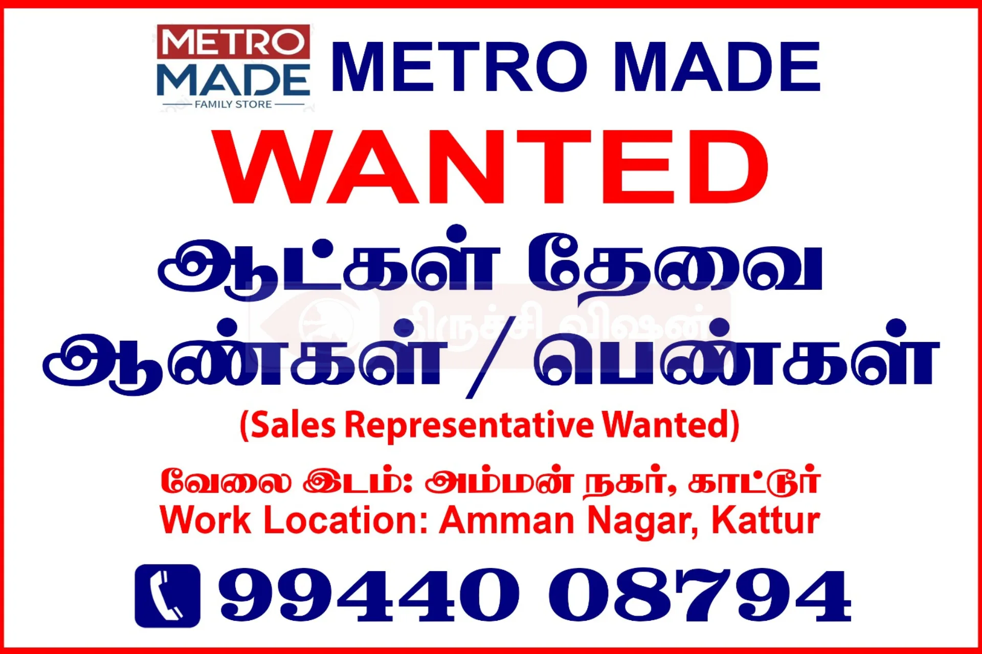 மெட்ரோ மேட் நிறுவனத்தில் வேலை வாய்ப்பு அறிவிப்பு.திருச்சி அருகே உள்ள அம்மன் நகர், கட்டூர் பகுதியில் செயல்பட்டு வரும் Metro Made Family Store நிறுவனத்தில் ஆட்கள் தேவை என அறிவிக்கப்பட்டுள்ளது.
