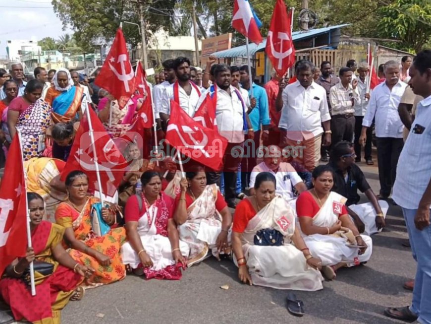 திருச்சி திருவெறும்பூர் அருகே உள்ள நவல்பட்டு, அண்ணாநகர் பகுதியில் 37ஆண்டுகளாக குடியிருந்து வரும் வீடுகள் மற்றும் மனைகளுக்கும் விரைந்து பட்டா வழங்க வேண்டும், நவல்பட்டு அண்ணாநகர் பகுதியில் நிறுத்தி வைக்கப்பட்டுள்ள பத்திரப்பதிவை உடனடியாக தொடர நடவடிக்கை எடுக்க வலியுறுத்தியும் துப்பாக்கி தொழிற்சாலை செல்லும் சாலையில் நவல்பட்டு – பர்மா காலனியில்
