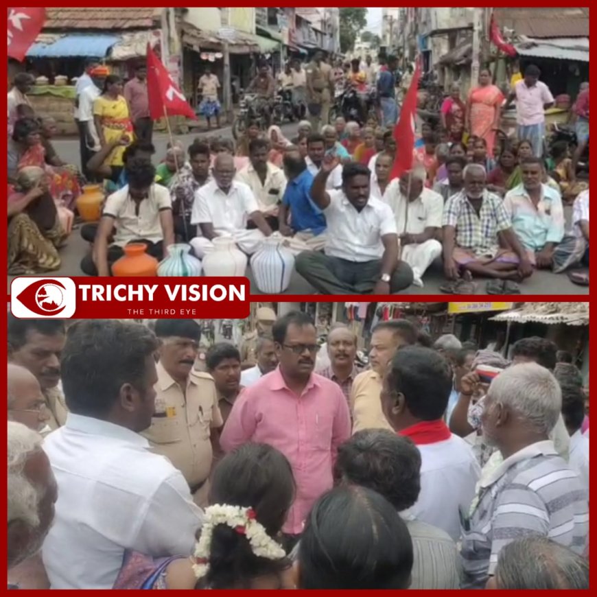 திருச்சி மாவட்டம், முசிரி அருகே தா.பேட்டை பேரூராட்சி அமைந்துள்ளது. இந்த பேரூராட்சிக்குட்பட்ட பகுதிகளுக்கு காவிரி குடிநீர் தட்டுப்பாடு காரணமாக வாரத்திற்கு ஒருமுறை குடிநீர் வழங்கப்பட்டு வருவதாக கூறி மார்க்சிஸ்ட் கம்யூனிஸ்ட் கட்சியினர் பேரூராட்சி அலுவலகத்தை முற்றுகையிட்டு போராட்டம் நடத்தப்போவதாக அறிவித்திருந்தனர்.