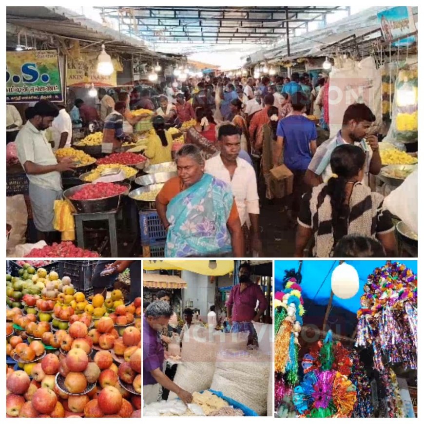 திருச்சி காந்தி மார்க்கெட் பகுதியில் ஆயுத பூஜைக்கான பூஜை பொருட்கள் விற்பனை படுஜோராக நடந்து வருகிறது. அனைத்து பூஜை பொருட்களின் விலையும் உயர்ந்த நிலையில் ஆர்வமாக வந்து பூஜை பொருட்களை பொதுமக்கள் வாங்கி செல்கின்றனர்.