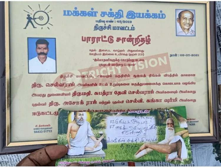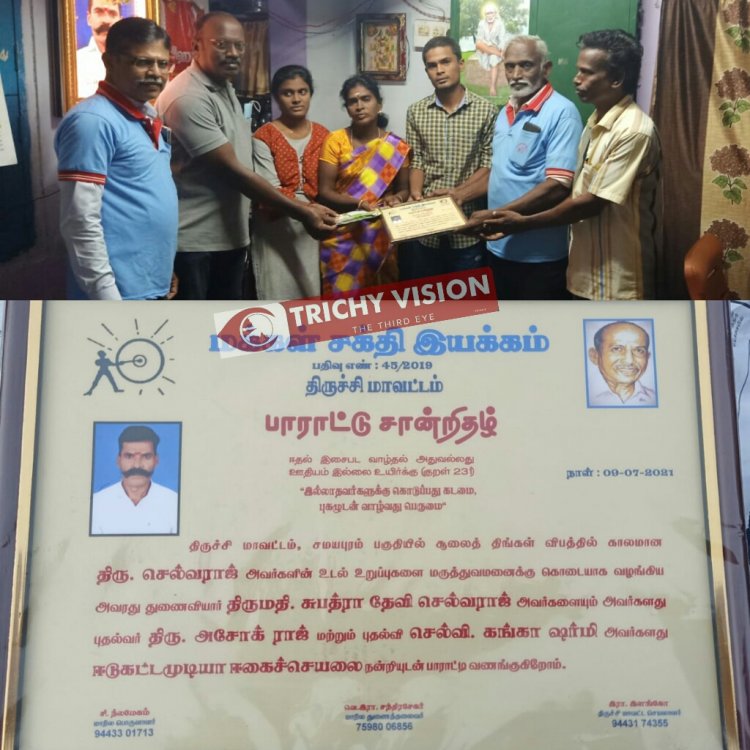 இறந்தும் அவர் உயிர் வாமும் விதமாக அவரது உடல் உறுப்புகளை தானமாக வழங்கியதற்கு, திருச்சி மாவட்ட மக்கள் சக்தி இயக்கம் சார்பாக செல்வராஜ் மகள் படிப்பு செலவிற்கு 10,000 ரூபாயயும் ஈடுகட்ட முடியாத ஈகைச் செயலை பாராட்டி சான்றிதழும் வழங்கி பாராட்டுகள் தெரிவிக்கப்பட்டது.