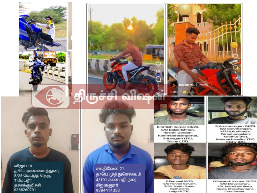 திருச்சி மாவட்டம், இலால்குடி காவல் நிலைய எல்லைக்குட்பட்ட பகுதிகளில் தீபாவளி பண்டிகை கொண்டாட்டத்தின் போது இரு சக்கர வாகனத்தில் சாகசம் என்ற பெயரில் பிறரை அச்சுறுத்தும் வகையில் பைக் ஓட்டிச் சென்று பொது அமைதிக்கு பங்கம் விளைவித்த 1) அருள்முருகன் 24, த.பெ. சௌந்தரராசன், குடித்தெரு. பனமங்லம், இலால்குடி. 2) கிரித்திஸ் 20, S/o பாலகிருஷ்ணன், கம்பரசம்பேட்டை, ஸ்ரீரங்கம், 3) வசந்தகுமார் 20. த.பெ. தேவேந்திரன், கீழசிந்தாமணி. திருச்சி 4) பெருமாள் என்ற தேசிங்க பெருமாள் 18. த.பெ. பன்னீர்செல்வம், எசனை கோரை. இலால்குடி மற்றும் 5) முகமது ரியாஸ்தீன் 22 த/பெ முகமது ஜின்னா, 6) முத்து, தாராநல்லூர், திருச்சி மற்றும் 7) சித்தார்த், குமரன் நகர், திருச்சி, ஆகியோர்கள் மீது இலால்குடி காவல் நிலைய குற்ற orador. 514/23 u/s 278, 279, 286, 336, 308, 144 r/w 184, 188 MV Actor படி வழக்கு பதிவு செய்தும், மேற்படி வழக்கில் 1 முதல் 5-ஆம் வரையுள்ள எதிரிகளை கைது செய்தும், அவர்கள் பயன்படுத்திய Yamaha MT15, TN-40-T-1068, Yahama R15, TN-48-AP-0003 & KTM Duke 390, TN-81-M-5022 ஆகிய வாகனங்களை பறிமுதல் செய்தும், நீதிமன்ற காவலுக்கு அனுப்பப்பட்டுள்ளார்கள். மேலும் மேற்படி வழக்கில் தொடர்புடைய 6 மற்றும் 7ஆம் எதிரிகள் தலைமறைவாக இருந்து வருகிறார்கள்