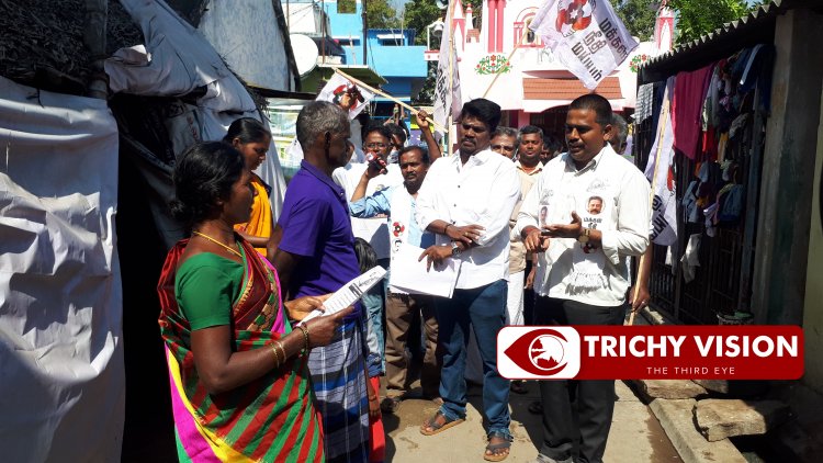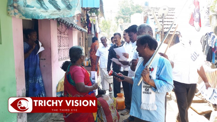 திருச்சி மக்கள் நீதி மய்யம் மத்திய மாவட்ட பொறுப்பாளர் கிஷோர் குமார் தலைமையில் மக்கள் நீதி மையம் கட்சியினர் வீடுவீடாக சென்று பொதுமக்களிடம் நேர்மையான துரித நிர்வாகம், இல்லத்தரசிகளுக்கு ஊதியம், சூழலியல் சுகாதாரம், மின்னணு இல்லங்கள், பசுமைப்புரட்சி உள்ளிட்ட தீர்மானங்களை சொல்லி வாக்கு சேகரிப்பில் தற்போது ஈடுபட்டுள்ளனர்.