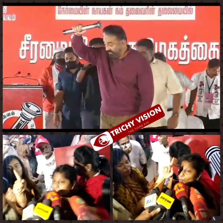 திருச்சியில் 9 சட்டமன்ற தொகுதிகளில் போட்டியிடும் மக்கள் நீதி மய்ய மற்றும் கூட்டணிக் கட்சிகளின் வேட்பாளரை ஆதரித்து  கமல் பரப்புரை செய்து புறப்பட்ட பொழுது அருகில் இருந்த ஒரு பெண்மணி கமலின் காலில் ஒரு புத்தகத்தை காதிதங்களை தூக்கி எறிந்து ஆவேசமாக பேசி நியாயம் கேட்டார். இதனால் அந்த இடம் பரபரப்பானது. அந்த பெண்ணை மக்கள் நீதி மைய நிர்வாகிகள் இழுத்துப் பிடித்து வெளியே கொண்டு சென்றனர்.