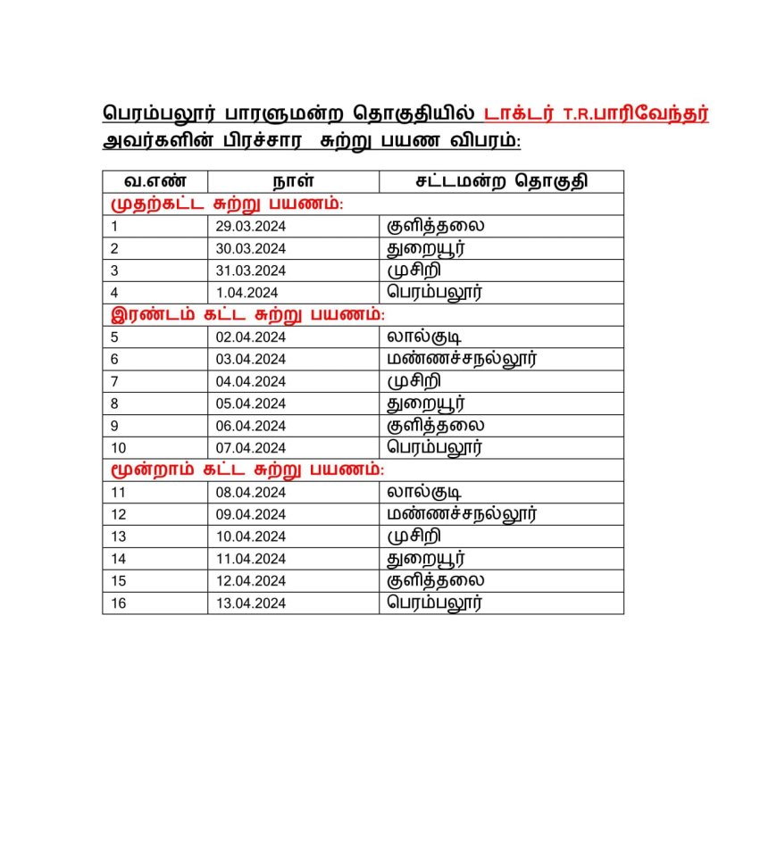 இந்திய ஜனநாயக கட்சியின் நிறுவனர் பாரிவேந்தர் பெரம்பலூர் பாராளுமன்ற தொகுதியில் போட்டியிடுகிறார். தாமரை சின்னத்தில் போட்டியிடும் இவர் பெரம்பூர் பாராளுமன்ற தொகுதிக்கு உட்பட்ட பகுதிகளில் நாளை முதல் சுற்றுப் பயணம் செய்யும் இடங்களின் விபரங்கள் அறிவிக்கப்பட்டுள்ளன.