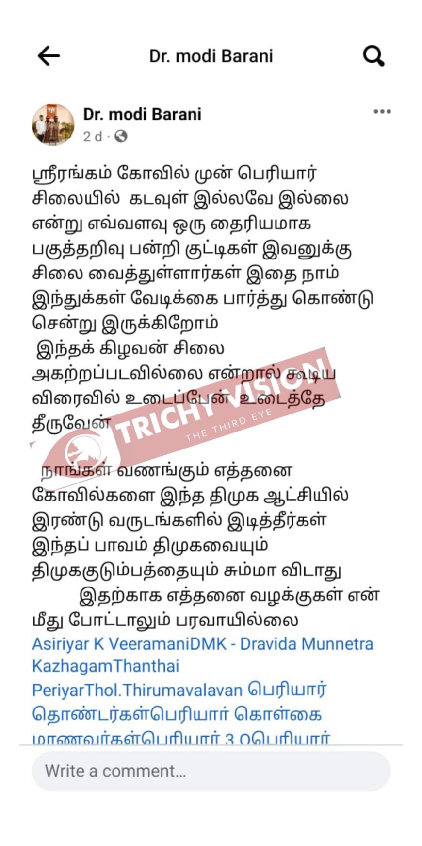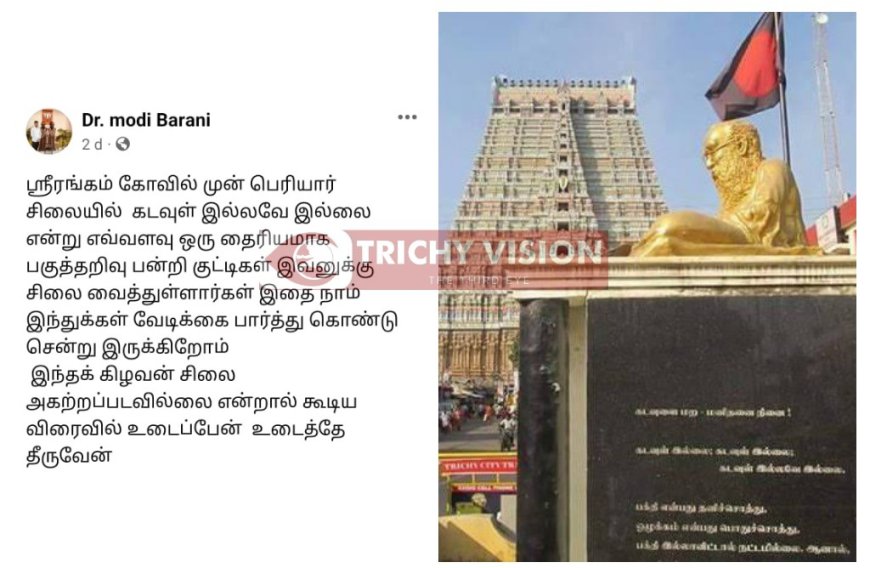 ஸ்ரீரங்கத்தில் பெரியார் சிலையை இடித்துத் தள்ள வேண்டும் – எக்ஸ் தளத்தில் பதிவு செய்த நபரால் பரபரப்பு