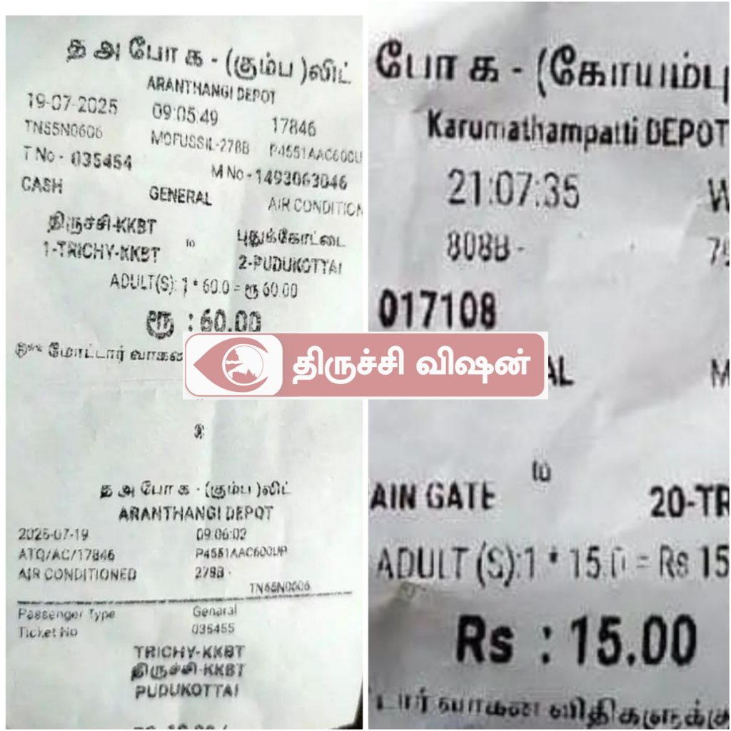 திருச்சியிலிருந்து புதுக்கோட்டை சென்ற A/C பேருந்துகள் ரூ.60/-க்கு பதிலாக ரூ.70/-ம் வசூல் செய்யப்படுகிறது. சாதாரண கட்டண பேருந்துகளில் ரூ.47/-க்கு பதில் ரூ.52/-ம், ரூ.52/-ம், இடைநில்லா புறநகர் பேருந்துக்கு ரூ.50/-க்கு பதில் .55/-வசூலிக்கப்படுகிறது. நகரப்பேருந்துகளில் சத்திரம் முதல் ஜங்சன் வரை ரூ.10/-வசூலிக்கப்பட்ட நிலையில், பஞ்சப்பூருக்கு கூடுதலாக சேர்த்து ரூ.15/- வசூலிக்கப்படுகிறது.