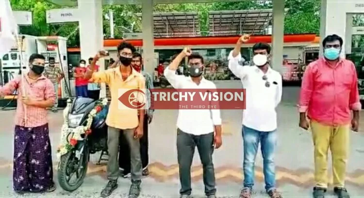 இந்த விலை ஏற்றத்தால் வாகன ஓட்டிகள் சிரமத்தை எடுத்துரைக்கும் விதமாகவும், மோடி அரசை கண்டித்தும் திருச்சி மாநகர் மாவட்டம் DYFI ஜங்சன் பகுதிக்குழு சார்பாக அரிஸ்டோ ரவுண்டானா பெட்ரோல் பங்க் முன்பு இருசக்கர வாகனத்திற்கு மாலை அணிவித்து இறுதி சடங்கு செய்வது போல் நூதன போராட்டம் நடைபெற்றது.