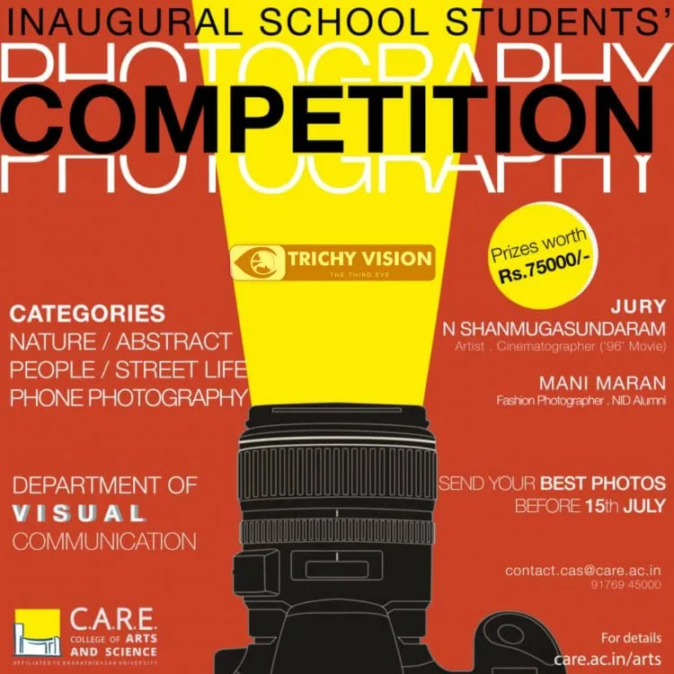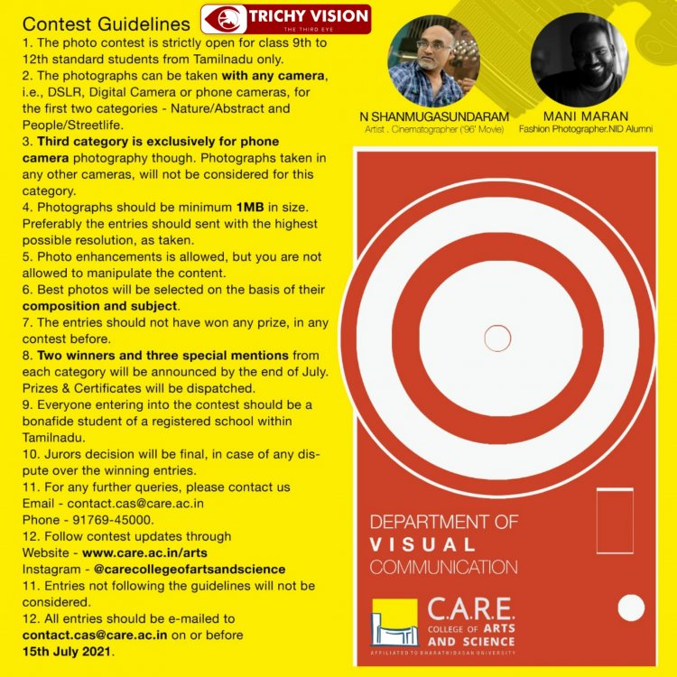 கேர் காலேஜ் ஆஃப் ஆர்ட்ஸ் அண்ட் சயின்ஸ் கல்லூரியின் காட்சி தொடர்பு துறை சார்பில் பள்ளி மாணவர்களுக்கான புகைப்பட போட்டி நடைபெற இருக்கிறது.