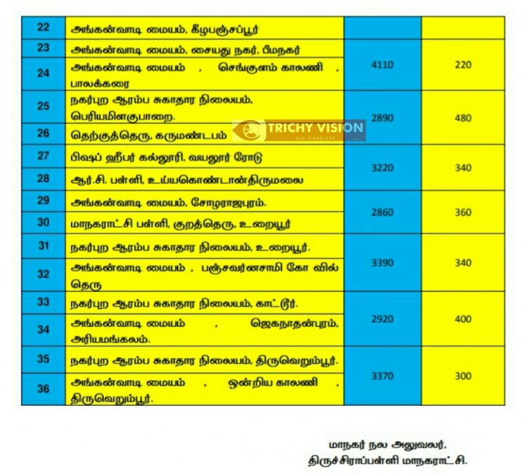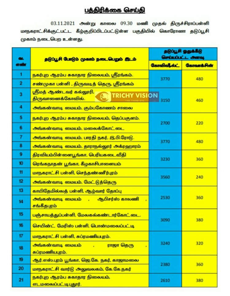 திருச்சி மாநகரில் நாளை (03.11.2021) கோவிசீல்டு, கோவாக்சின் தடுப்பு ஊசிகள் போடப்படும் இடங்களை மாநகராட்சி நிர்வாகம் அறிவித்துள்ளது.