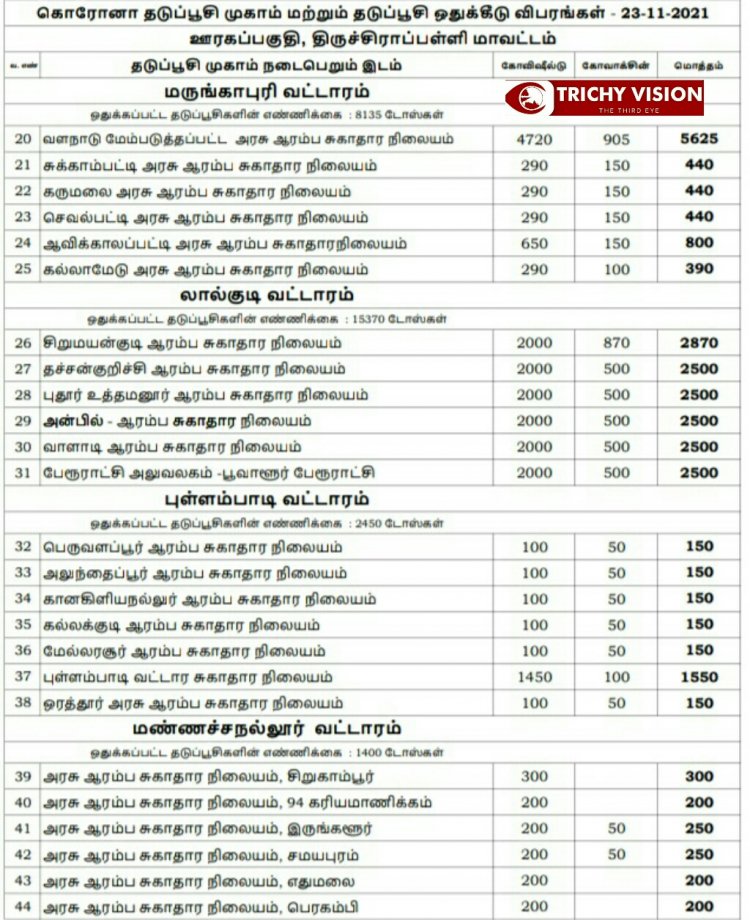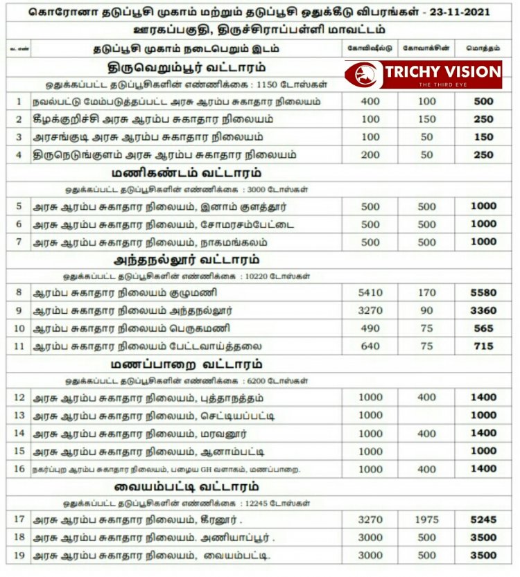 திருச்சி மாவட்டத்தில் இன்று (23.11.2021) கோவிசீல்டு, கோவாக்சின் தடுப்பு ஊசிகள் போடப்படும் இடங்களை மாவட்ட நிர்வாகம் அறிவித்துள்ளது.