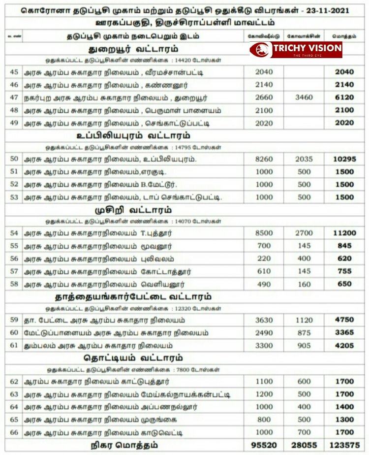 திருச்சி மாவட்டத்தில் நாளை (23.11.2021) கோவிசீல்டு 95520 , கோவாக்சின் 28055 என மொத்தம் 123575 தடுப்பூசிகள் போடப்படும் என மாவட்ட ஆட்சியர் தெரிவித்துள்ளார்.