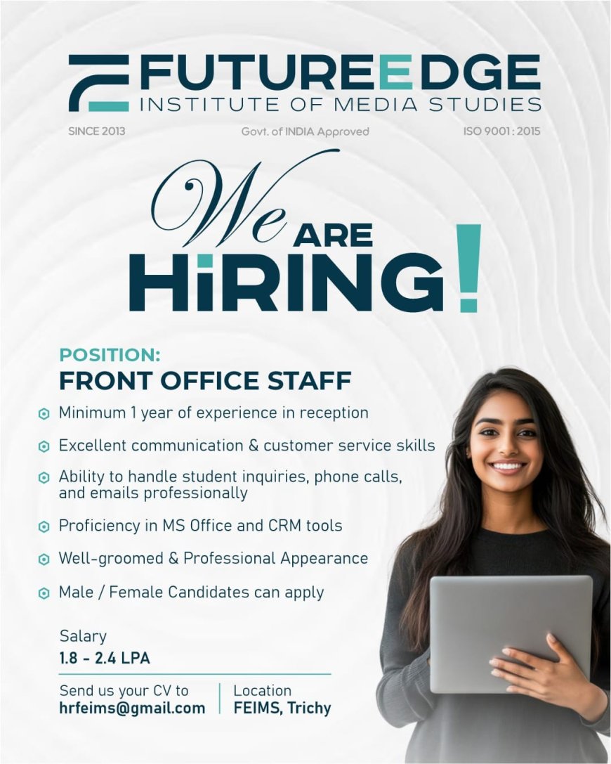 திருச்சி Futureedge இன்ஸ்டியூட் ஆப் மீடியாஸ் ஸ்டடிஸிஸ் நிறுவனத்திற்கு ஆபீஸ் ஸ்டாப் தேவை மேலும் விவரங்களுக்கு கீழே உள்ள படத்தை காணவும்.