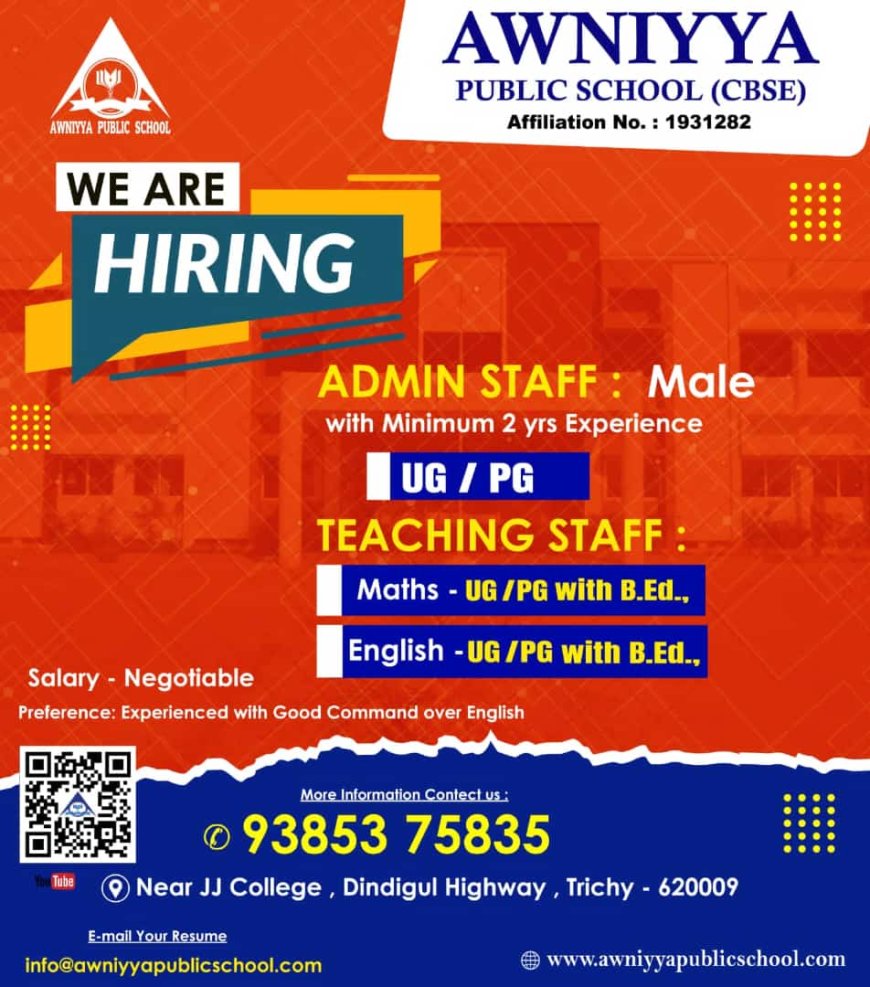 திருச்சி தனியார் பள்ளியில் வேலை வாய்ப்புகள் அறிவிக்கப்பட்டுள்ளன. மேலும் விவரங்களுக்கு கீழ் உள்ள படத்தை காணவும்