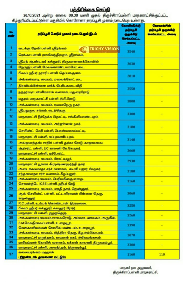 திருச்சி மாநகரில் நாளை (26.10.2021) கோவிசீல்டு, கோவாக்சின் தடுப்பு ஊசிகள் போடப்படும் இடங்களை மாநகராட்சி நிர்வாகம் அறிவித்துள்ளது.