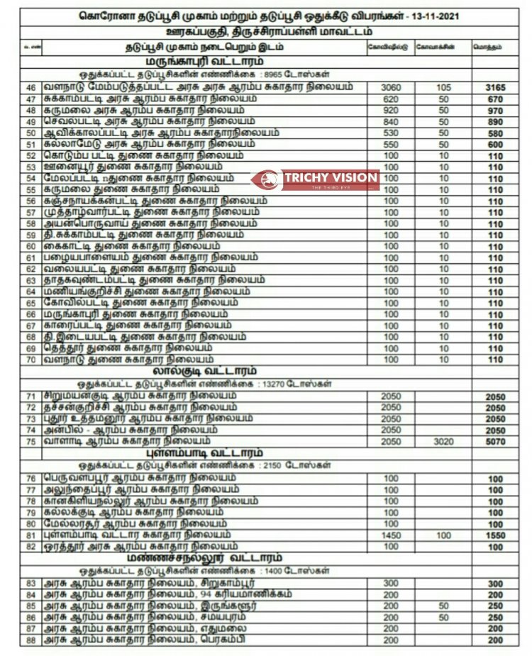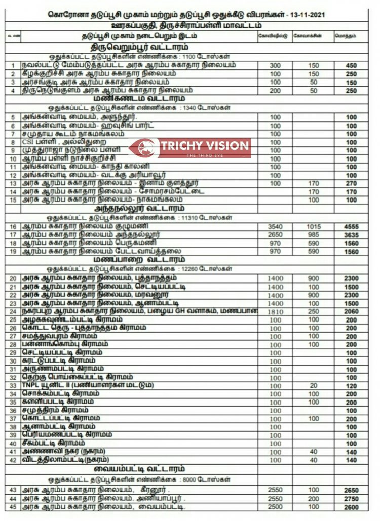திருச்சி மாவட்டத்தில் நாளை (13.11.2021) கோவிசீல்டு, கோவாக்சின் தடுப்பு ஊசிகள் போடப்படும் இடங்களை மாவட்ட நிர்வாகம் அறிவித்துள்ளது.