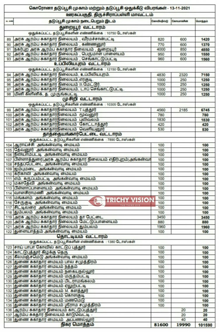 திருச்சி மாவட்டத்தில் நாளை (13.11.2021) கோவிசீல்டு 81600, கோவாக்சின் 19990 என மொத்தம் 101590 தடுப்பூசிகள் போடப்படும் என மாவட்ட ஆட்சியர் தெரிவித்துள்ளார்.