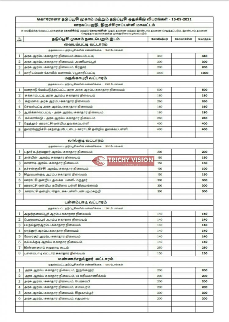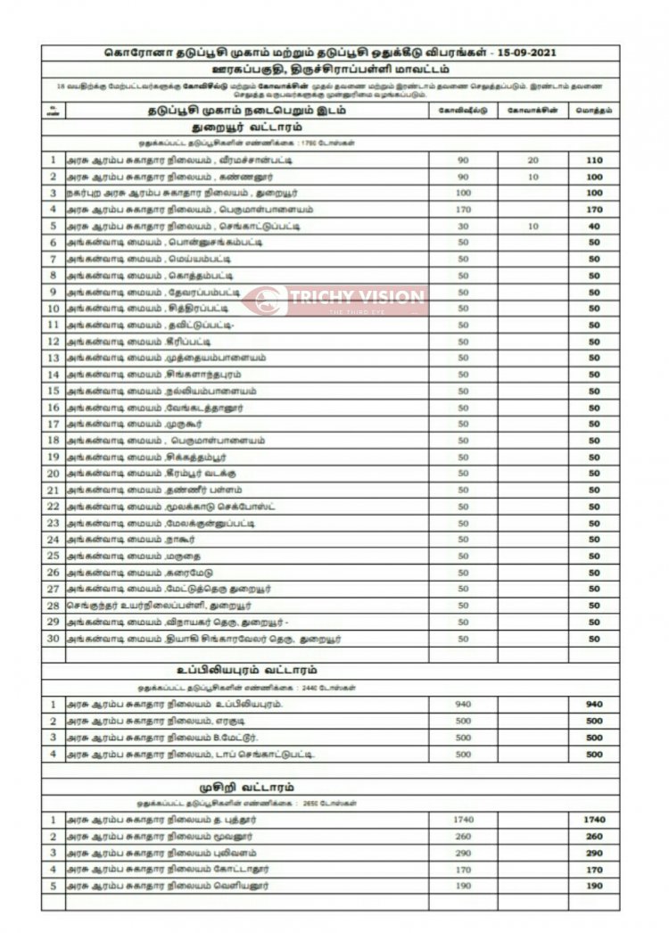 திருச்சி மாவட்டத்தில் நாளை (15.09.2021) கோவிசீல்டு, கோவாக்சின் தடுப்பு ஊசிகள் போடப்படும் இடங்களை மாவட்ட நிர்வாகம் அறிவித்துள்ளது.