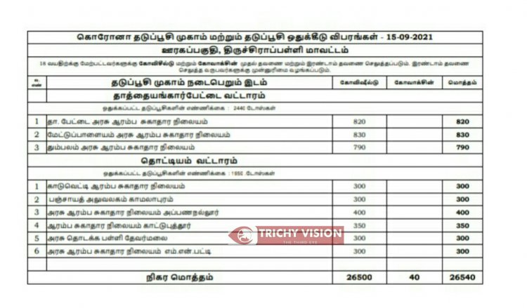திருச்சி மாவட்டத்தில் நாளை (15.09.2021) கோவிசீல்டு 26500, கோவாக்சின் 40 தடுப்பூசிகள் போடப்படும் என மாவட்ட ஆட்சியர் தெரிவித்துள்ளார்.