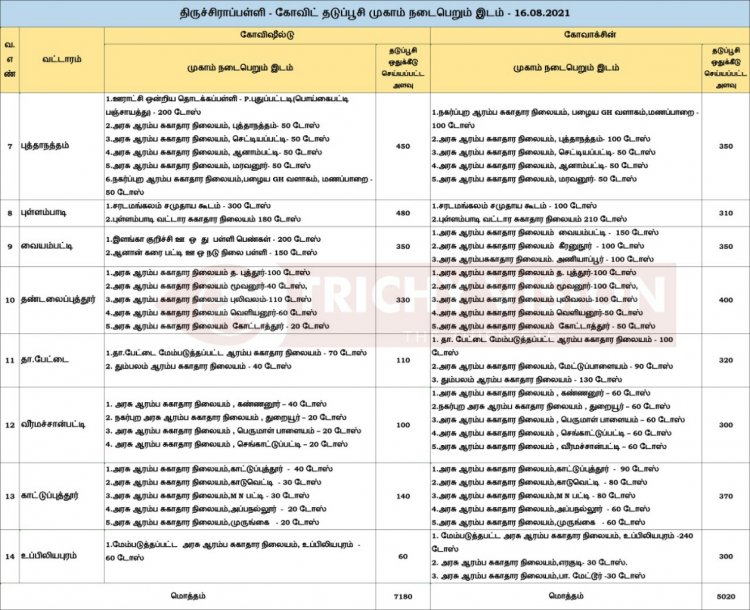 திருச்சி மாவட்டத்தில் நாளை (16.08.2021) 14 ஒன்றியங்களில் கோவிசீல்டு, கோவாக்சின் தடுப்பு ஊசிகள் போடப்படும் இடங்களை மாவட்ட நிர்வாகம் அறிவித்துள்ளது.