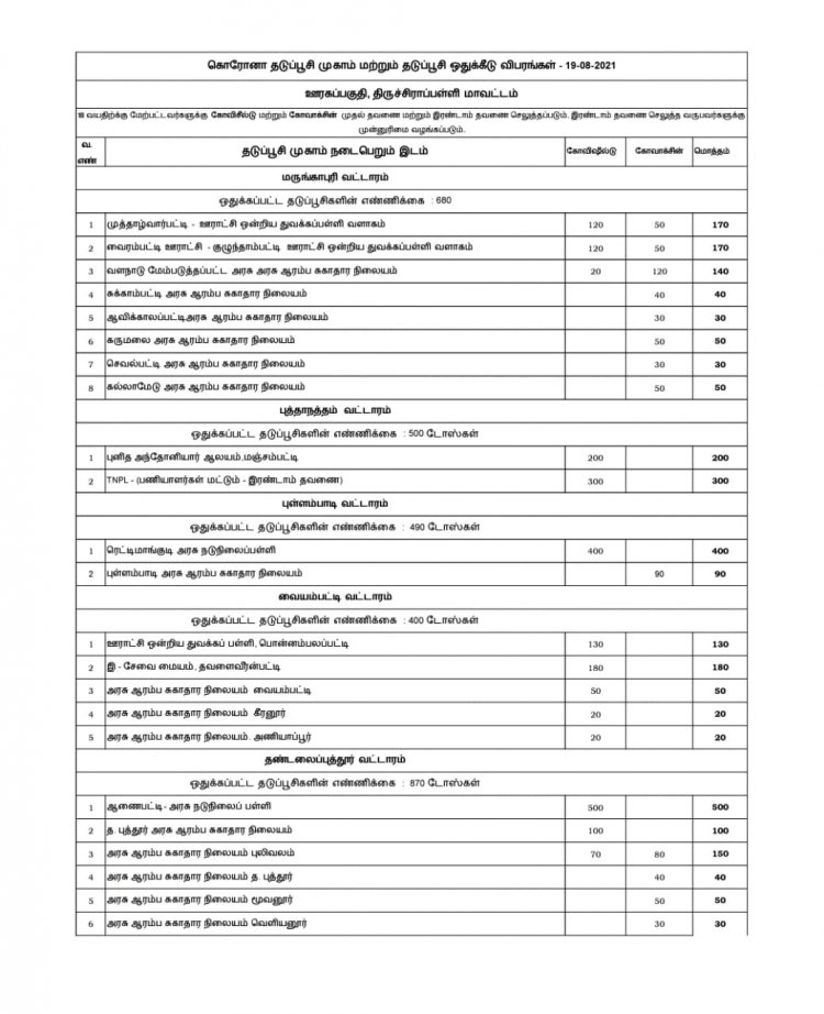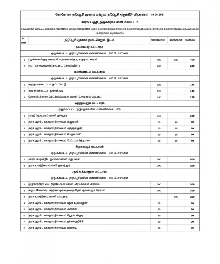 திருச்சி மாவட்டத்தில் நாளை (19.08.2021) 14 ஒன்றியங்களில் கோவிசீல்டு, கோவாக்சின் தடுப்பு ஊசிகள் போடப்படும் இடங்களை மாவட்ட நிர்வாகம் அறிவித்துள்ளது.