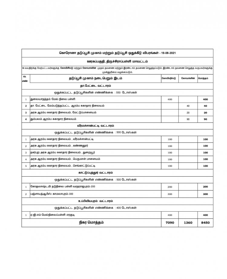 திருச்சி மாவட்டத்தில் நாளை (16.08.2021) கோவிசீல்டு 7090,  கோவாக்சின் 1360 தடுப்பூசிகள் போடப்படும் என மாவட்ட ஆட்சியர் தெரிவித்துள்ளார்.