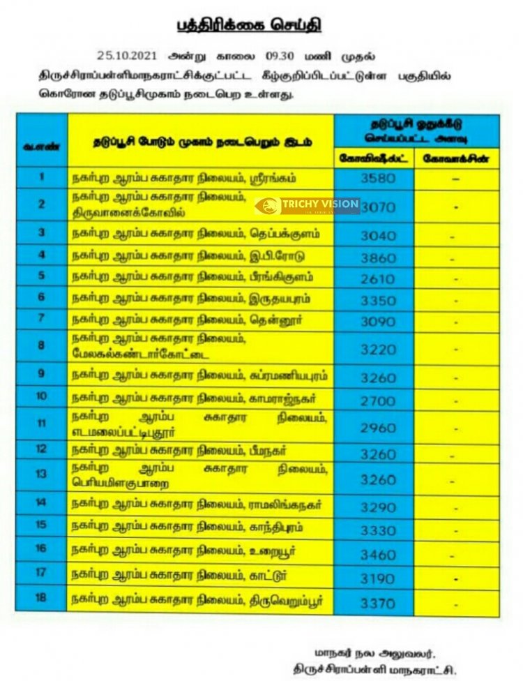 திருச்சி மாநகரில் நாளை (25.10.2021) கோவிசீல்டு தடுப்பு ஊசிகள் போடப்படும் இடங்களை மாநகராட்சி நிர்வாகம் அறிவித்துள்ளது.