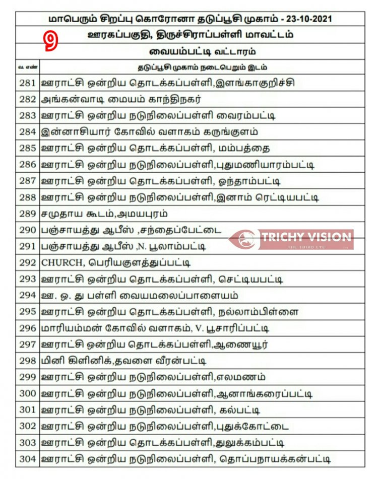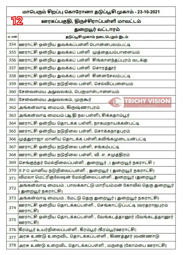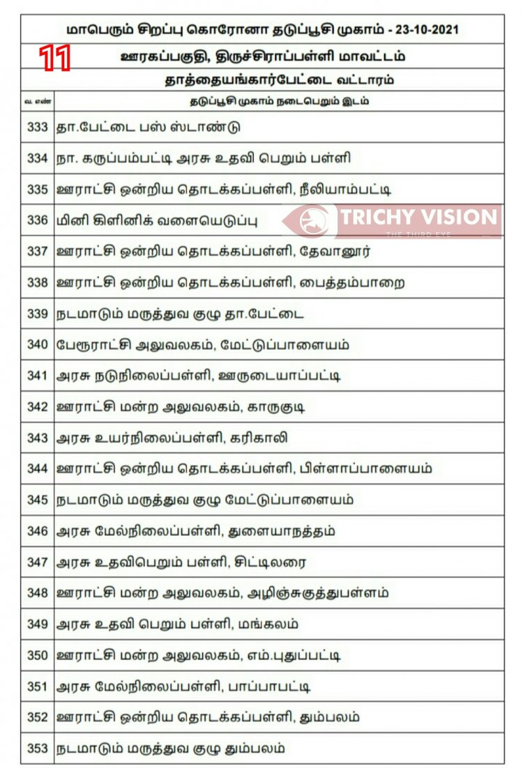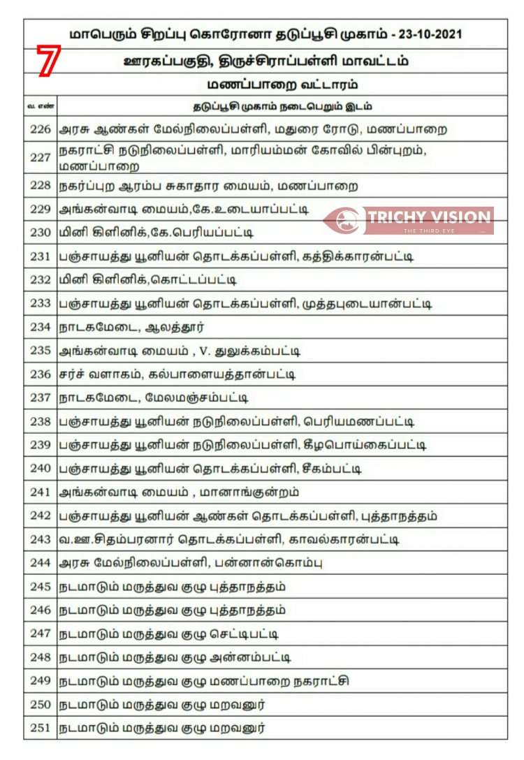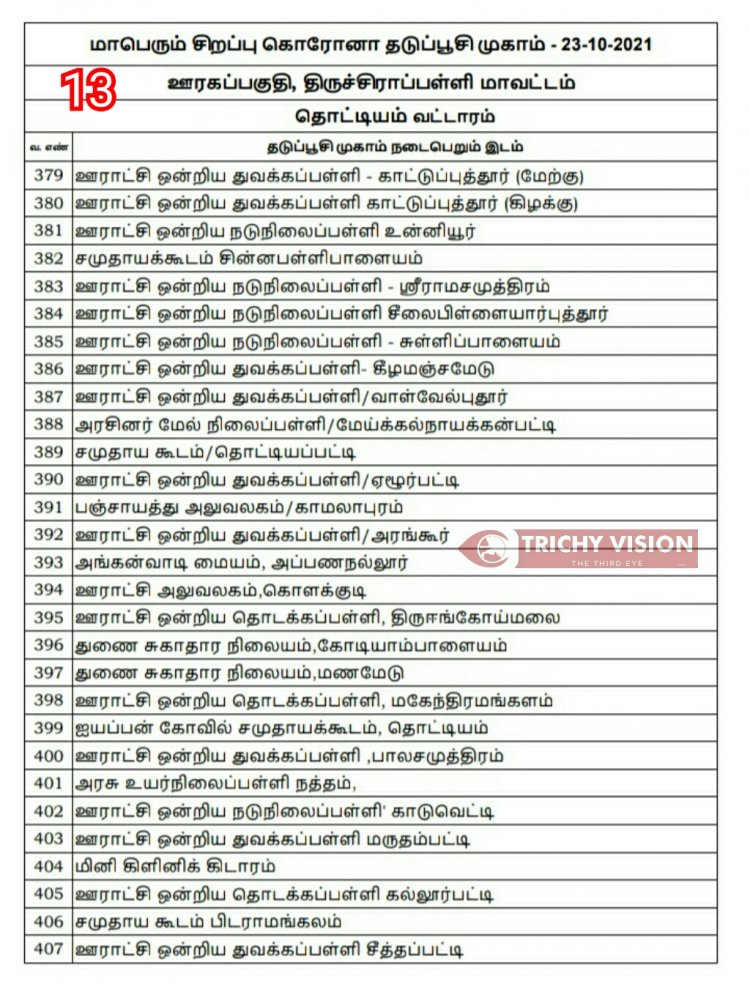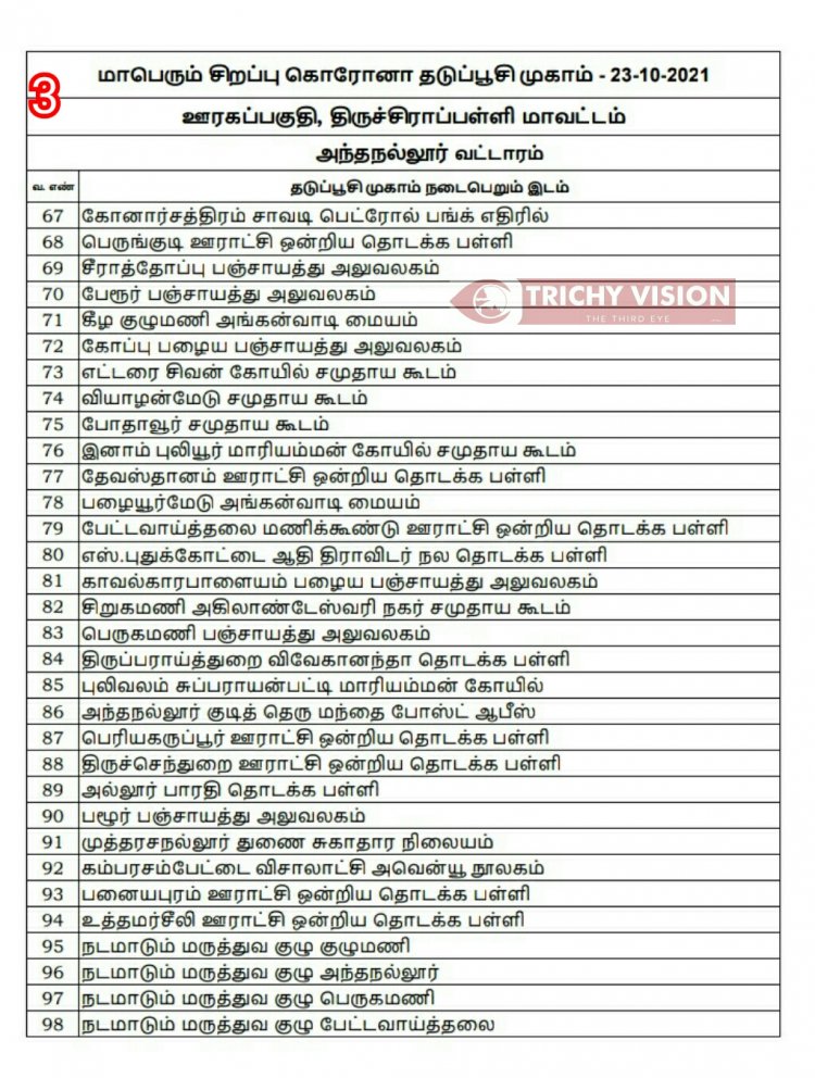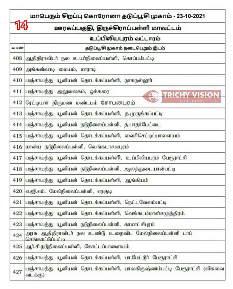திருச்சி மாவட்டத்தில் நாளை 23.10.2021 மாபெரும் கோவிட் தடுப்பூசி சிறப்பு முகாம் நடைபெற உள்ளது. இதில் 14 ஒன்றியங்களில் 427 இடங்களில் தடுப்பூசி சிறப்பு முகாம் நடைபெற இருக்கிறது. பொதுமக்கள் இந்த அரிய வாய்ப்பினை பயன்படுத்தி கோவிட் தடுப்பூசி செலுத்தி கொள்ளுமாறு மாவட்ட நிர்வாகம் தெரிவித்துள்ளது.