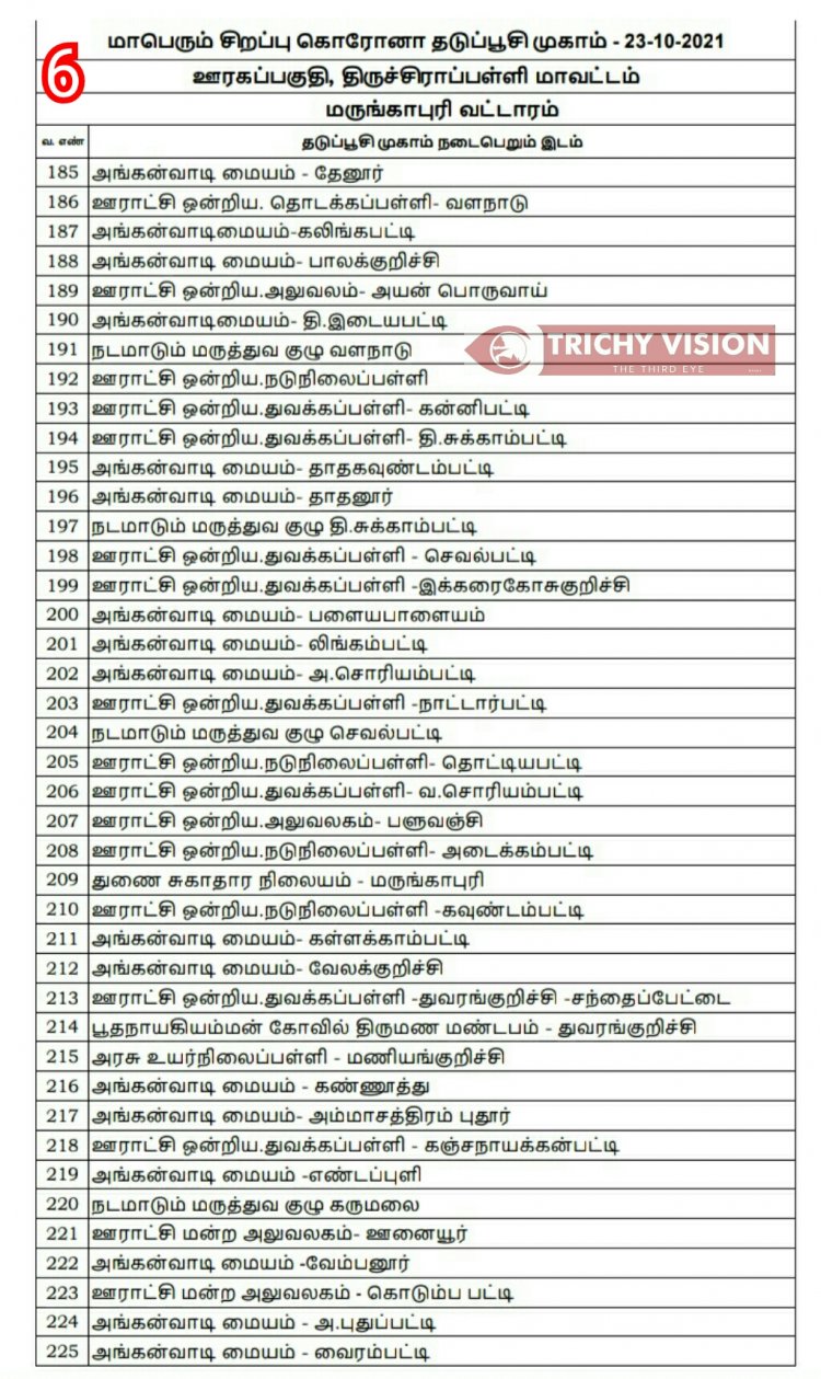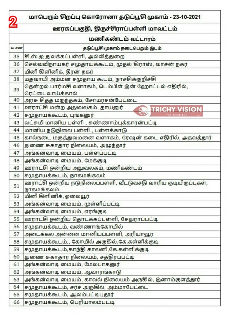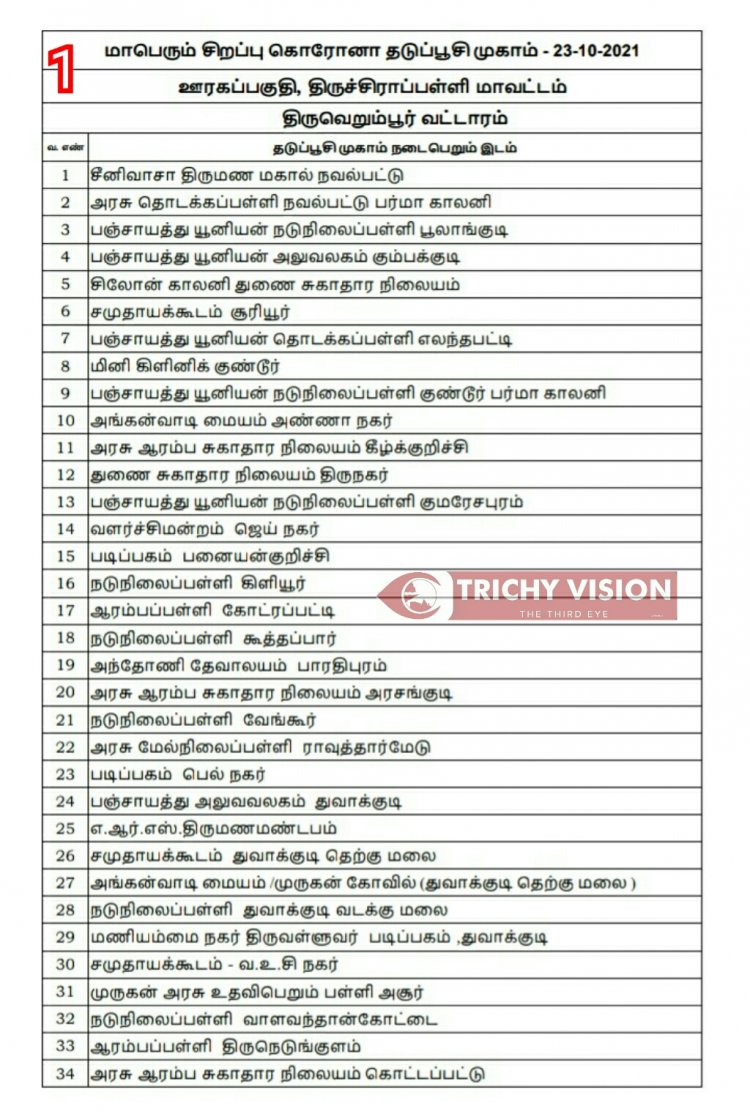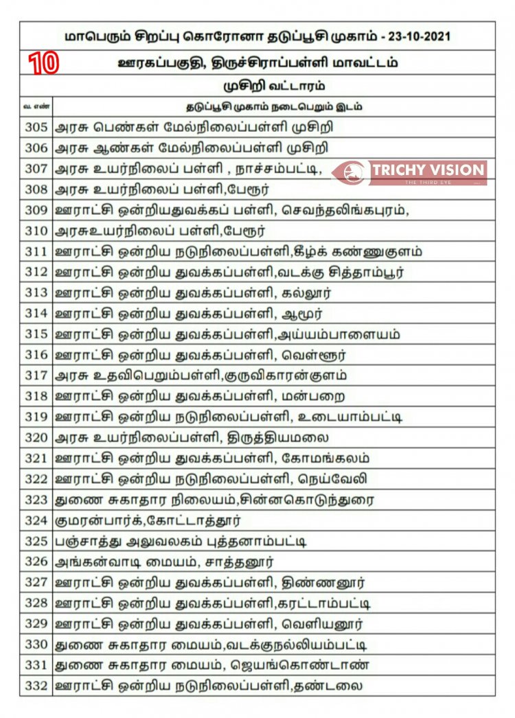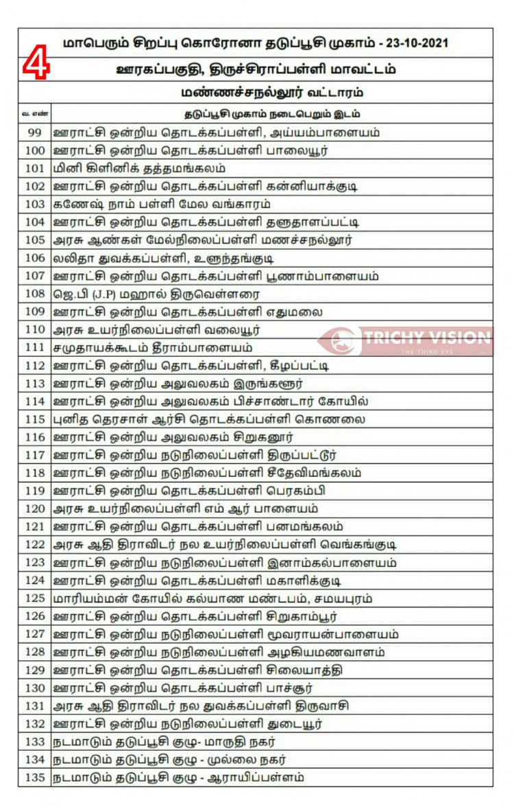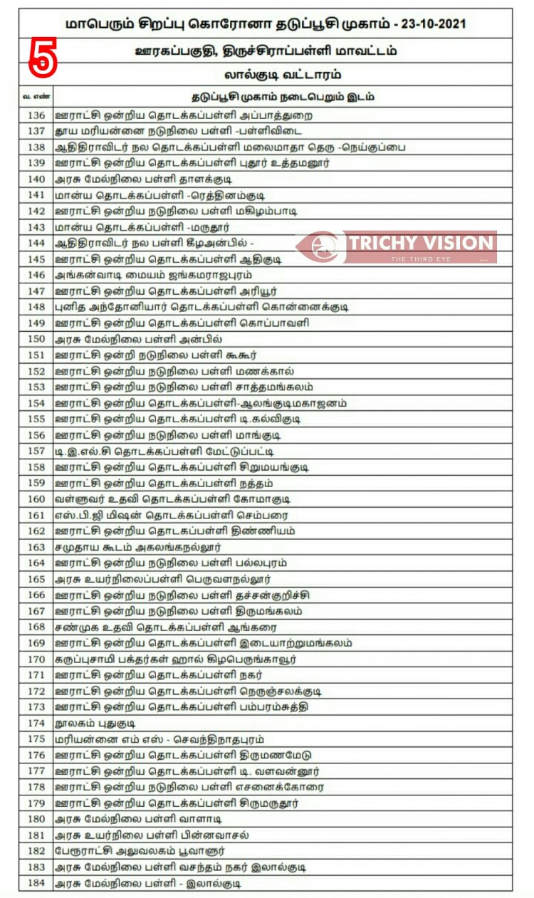 திருச்சி மாவட்டத்தில் நாளை 23.10.2021 மாபெரும் கோவிட் தடுப்பூசி சிறப்பு முகாம் நடைபெற உள்ளது. இதில் 14 ஒன்றியங்களில் 427 இடங்களில் தடுப்பூசி சிறப்பு முகாம் நடைபெற இருக்கிறது. பொதுமக்கள் இந்த அரிய வாய்ப்பினை பயன்படுத்தி கோவிட் தடுப்பூசி செலுத்தி கொள்ளுமாறு மாவட்ட நிர்வாகம் தெரிவித்துள்ளது.