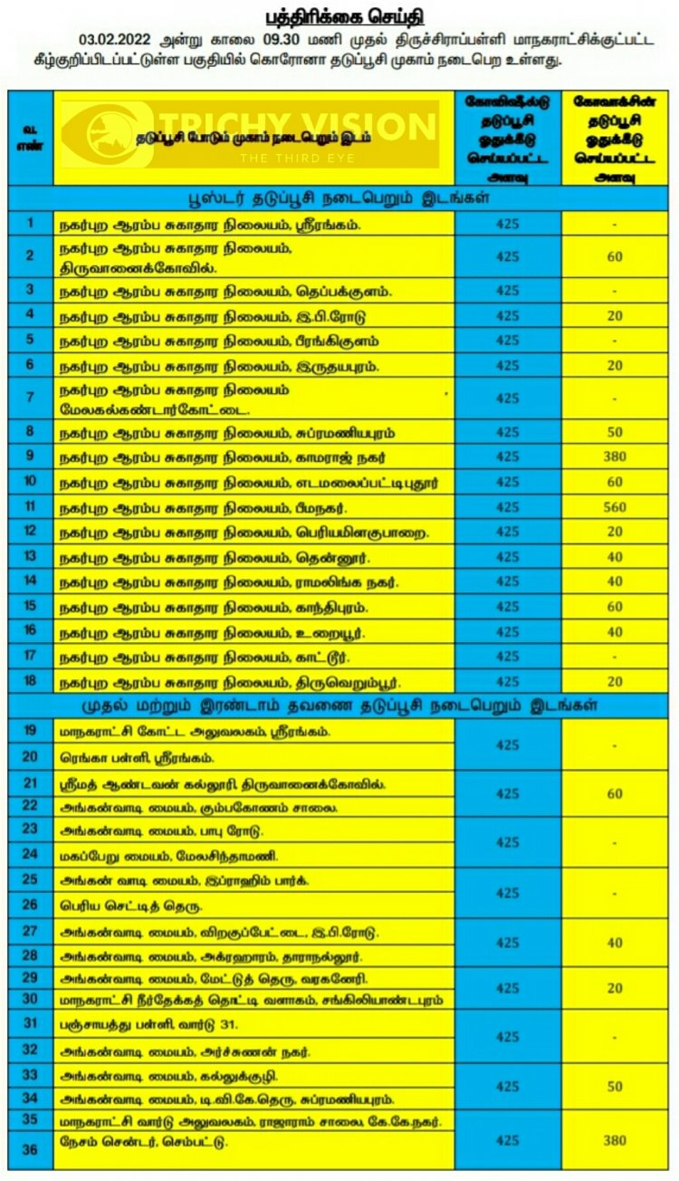 திருச்சி மாநகரில் இன்று (03.02. 2022) கோவிசீல்டு, கோவாக்சின் தடுப்பு ஊசிகள் போடப்படும் இடங்களை மாநகராட்சி நிர்வாகம் அறிவித்துள்ளது.