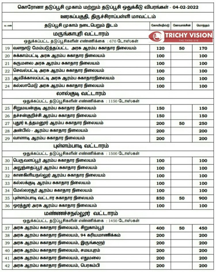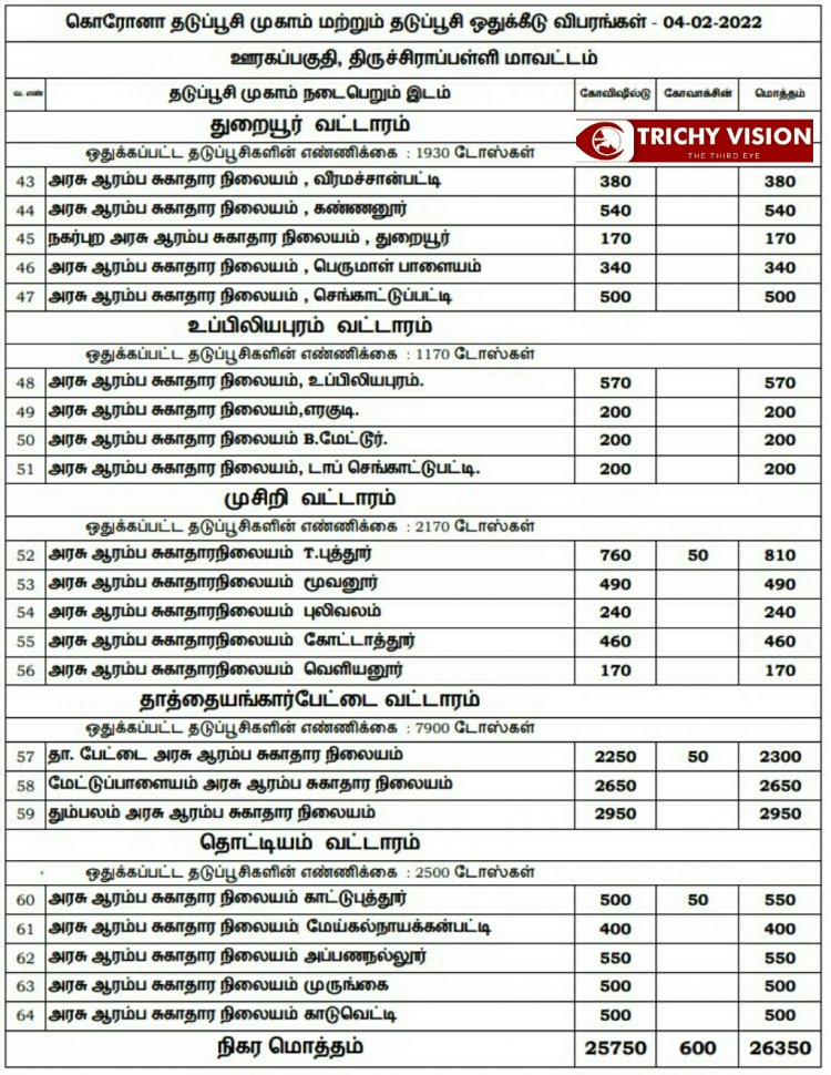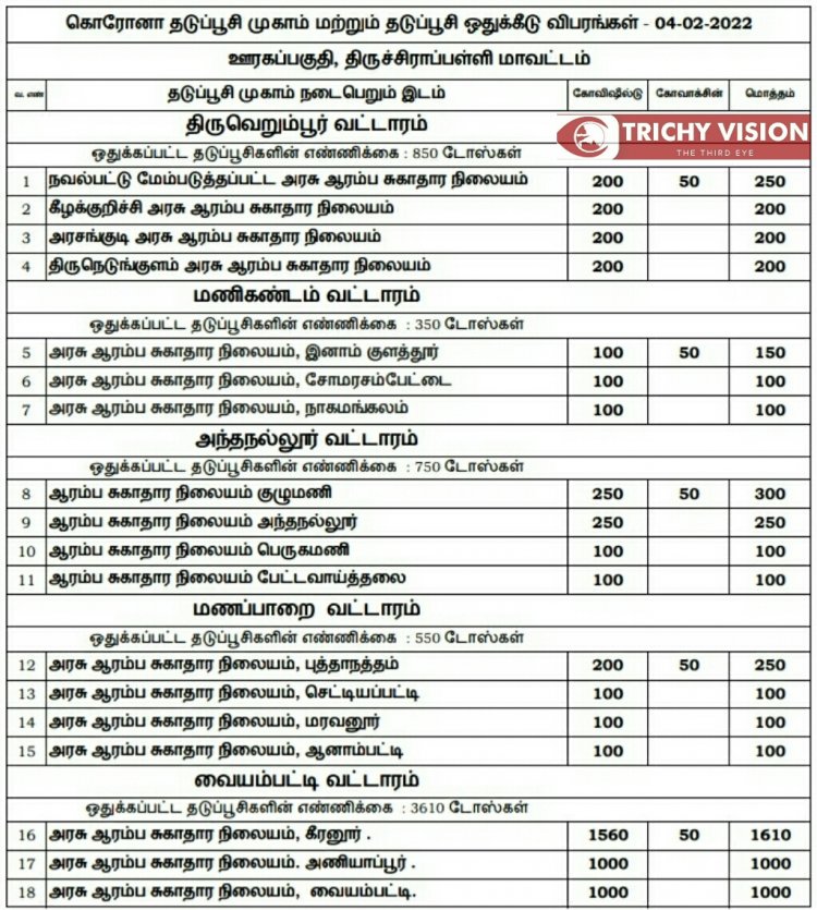 திருச்சி மாவட்டத்தில் நாளை (04.02.2022) கோவிசீல்டு, கோவாக்சின் தடுப்பு ஊசிகள் போடப்படும் இடங்களை மாவட்ட நிர்வாகம் அறிவித்துள்ளது.