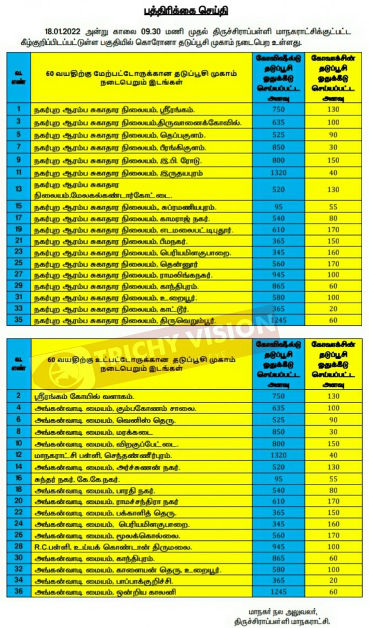 திருச்சி மாநகரில் நாளை (18.01.2022) கோவிசீல்டு, கோவாக்சின் தடுப்பு ஊசிகள் போடப்படும் இடங்களை மாநகராட்சி நிர்வாகம் அறிவித்துள்ளது.