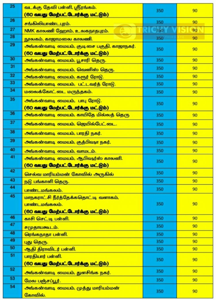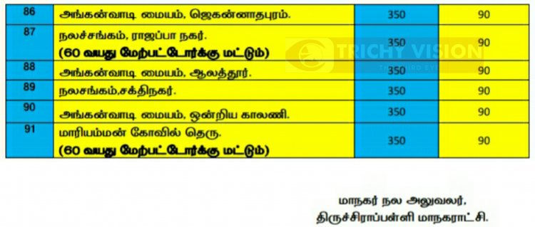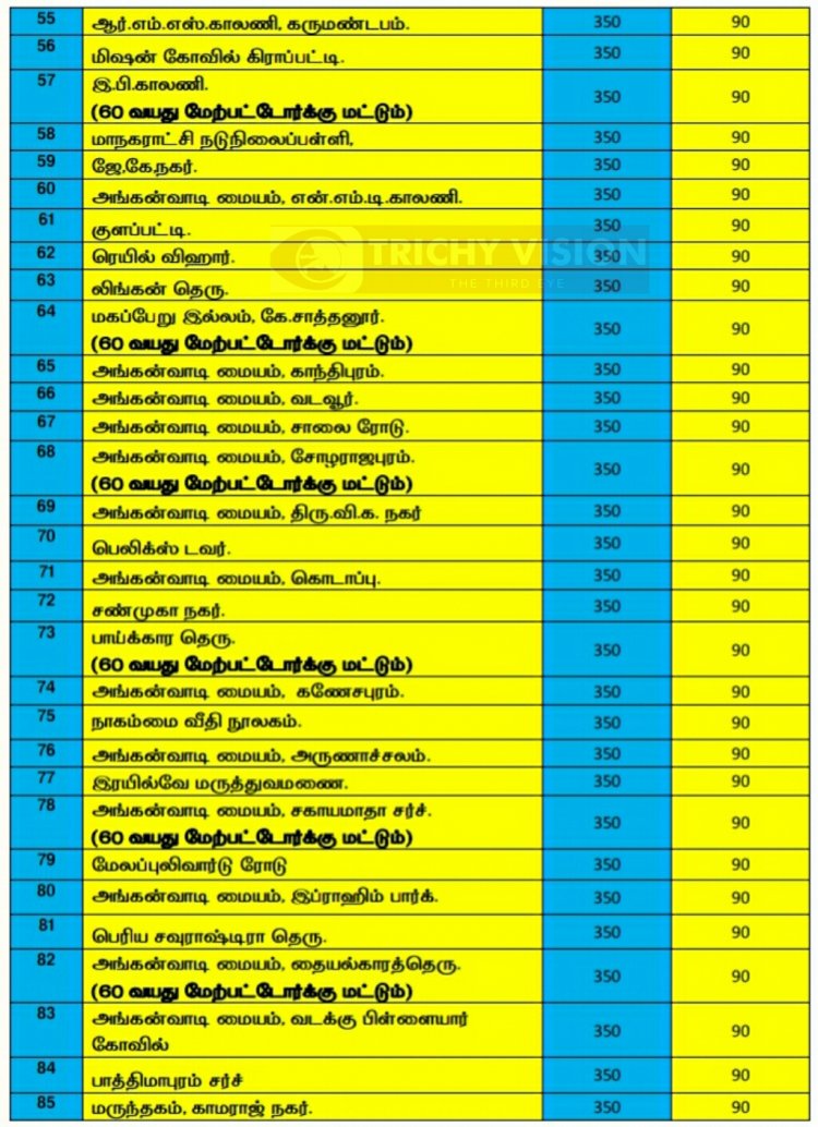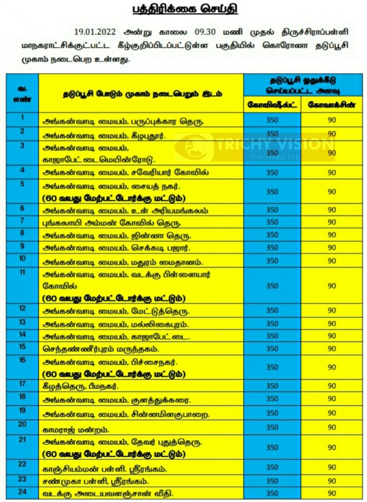 திருச்சி மாநகரில் இன்று (19.01.2022) கோவிசீல்டு, கோவாக்சின் தடுப்பு ஊசிகள் போடப்படும் இடங்களை மாநகராட்சி நிர்வாகம் அறிவித்துள்ளது.
