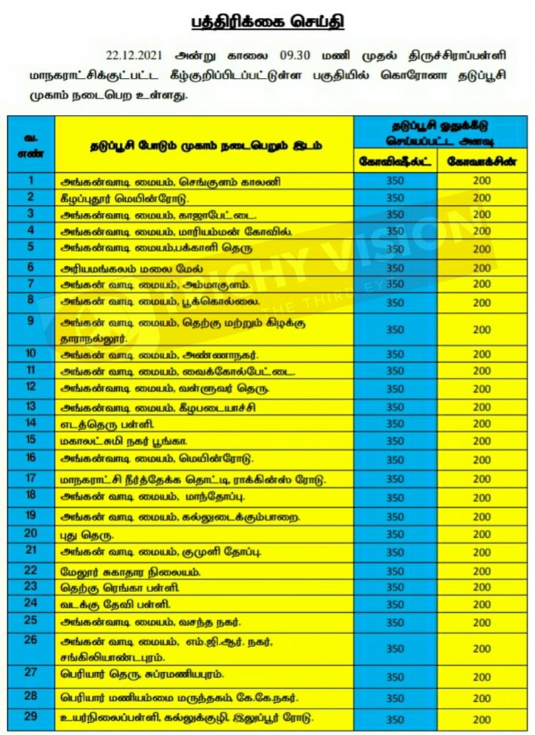 திருச்சி மாநகரில் நாளை (22.12.2021) கோவிசீல்டு, கோவாக்சின் தடுப்பு ஊசிகள் போடப்படும் இடங்களை மாநகராட்சி நிர்வாகம் அறிவித்துள்ளது.