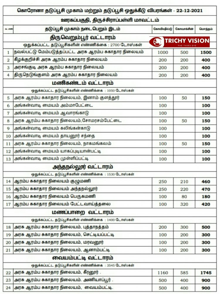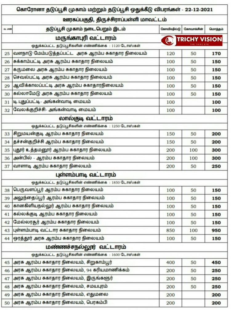 திருச்சி மாவட்டத்தில் நாளை (22.12.2021) கோவிசீல்டு, கோவாக்சின் தடுப்பு ஊசிகள் போடப்படும் இடங்களை மாவட்ட நிர்வாகம் அறிவித்துள்ளது.