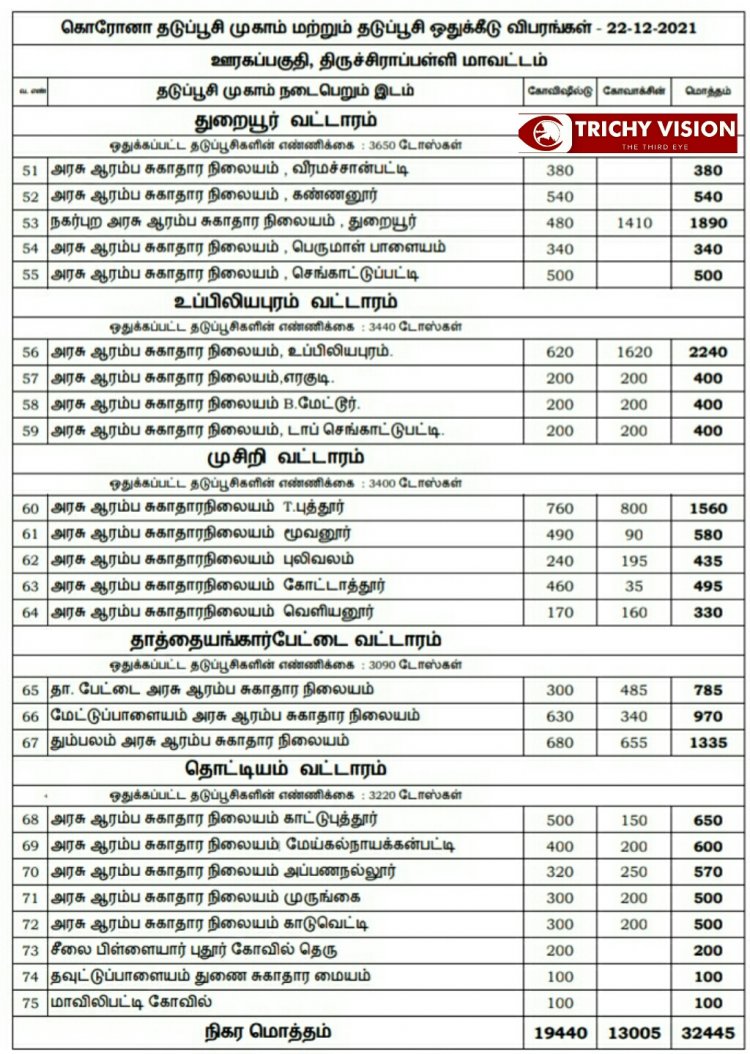 திருச்சி மாவட்டத்தில் நாளை (22.12.2021) கோவிசீல்டு 19440, கோவாக்சின் 13005 என மொத்தம் 32445 தடுப்பூசிகள் போடப்படும் என மாவட்ட ஆட்சியர் தெரிவித்துள்ளார்.