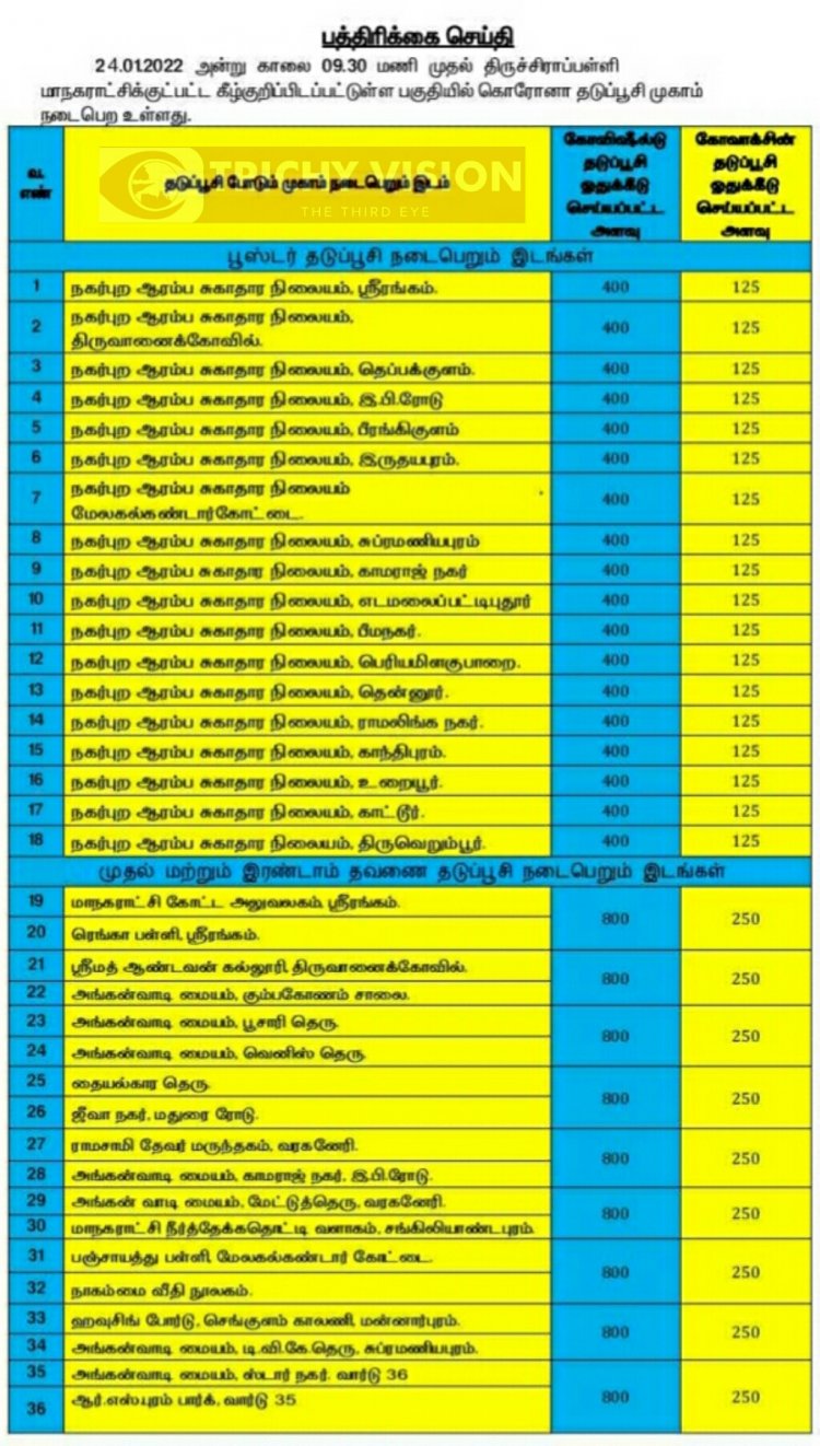 திருச்சி மாநகரில் நாளை (24.01.2022) கோவிசீல்டு, கோவாக்சின் தடுப்பு ஊசிகள் போடப்படும் இடங்களை மாநகராட்சி நிர்வாகம் அறிவித்துள்ளது.
