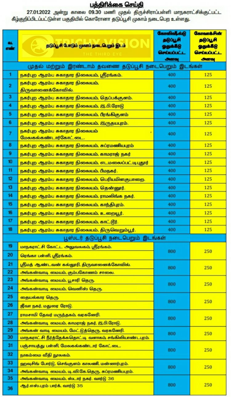 திருச்சி மாநகரில் (27.01.2022) கோவிசீல்டு, கோவாக்சின் தடுப்பு ஊசிகள் போடப்படும் இடங்களை மாநகராட்சி நிர்வாகம் அறிவித்துள்ளது.