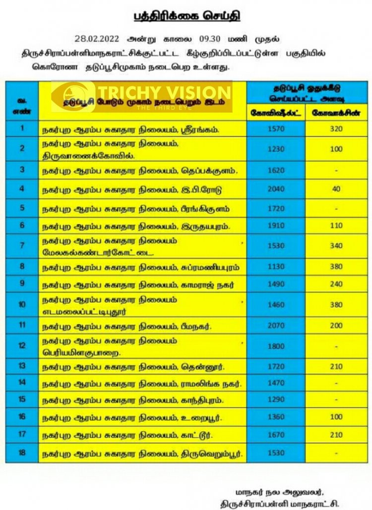 திருச்சி மாநகரில் நாளை (28.02.2022) கோவிசீல்டு, கோவாக்சின் தடுப்பு ஊசிகள் போடப்படும் இடங்களை மாநகராட்சி நிர்வாகம் அறிவித்துள்ளது.