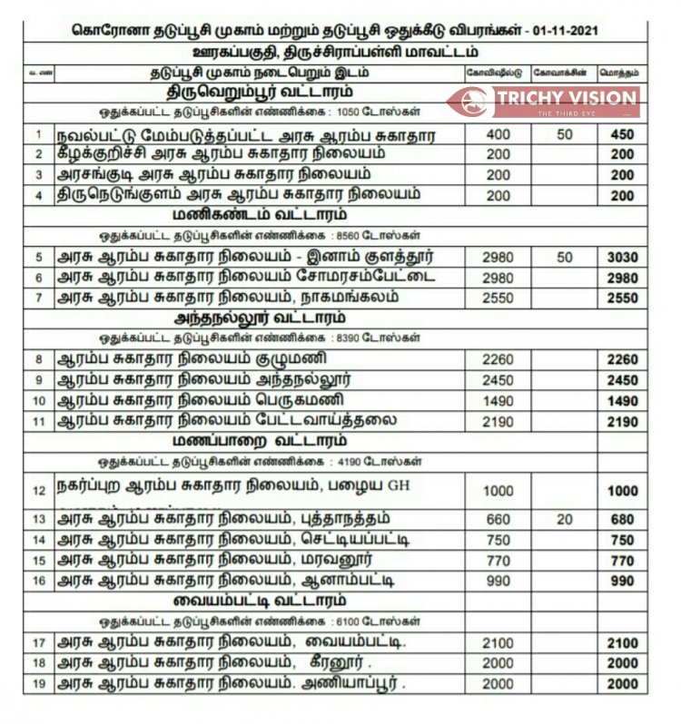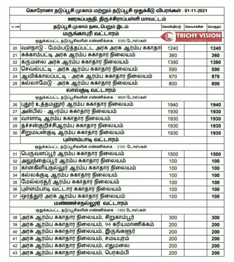 திருச்சி மாவட்டத்தில் நாளை (01.11.2021) கோவிசீல்டு, கோவாக்சின் தடுப்பு ஊசிகள் போடப்படும் இடங்களை மாவட்ட நிர்வாகம் அறிவித்துள்ளது.