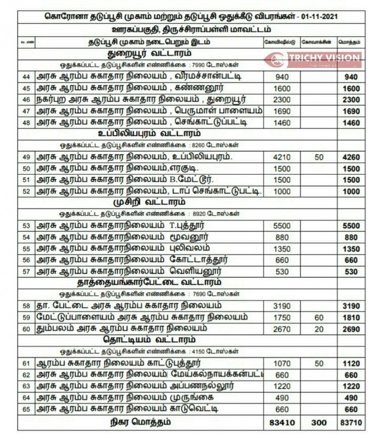 திருச்சி மாநகரில் நாளை (01.11.2021) கோவிசீல்டு 83410, கோவாக்சின் 300 என மொத்தம் 83710 தடுப்பூசிகள் போடப்படும் என மாவட்ட ஆட்சியர் தெரிவித்துள்ளார்.