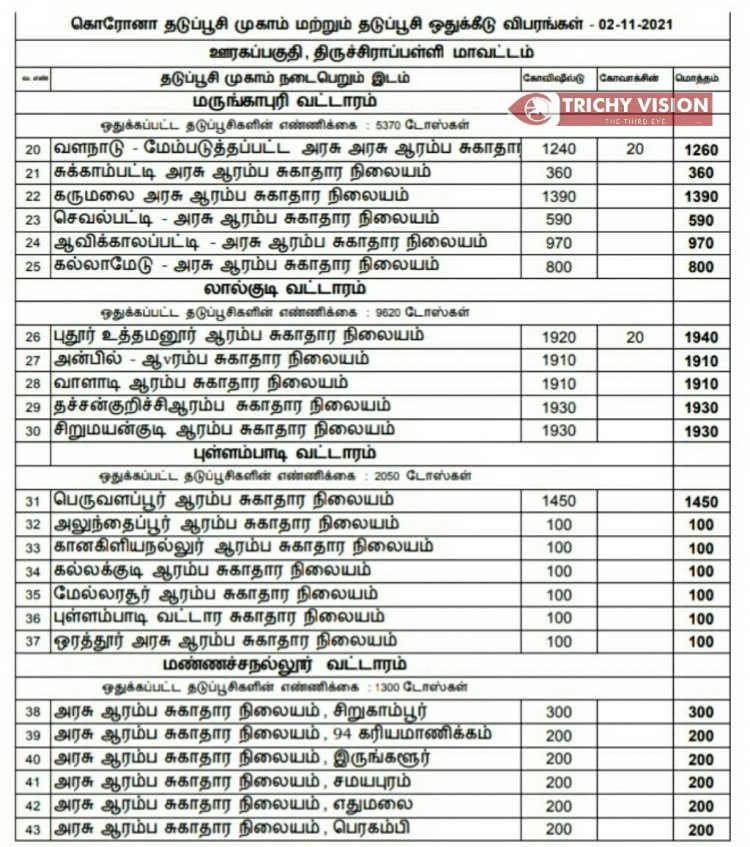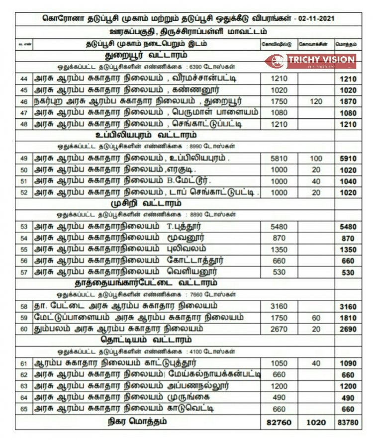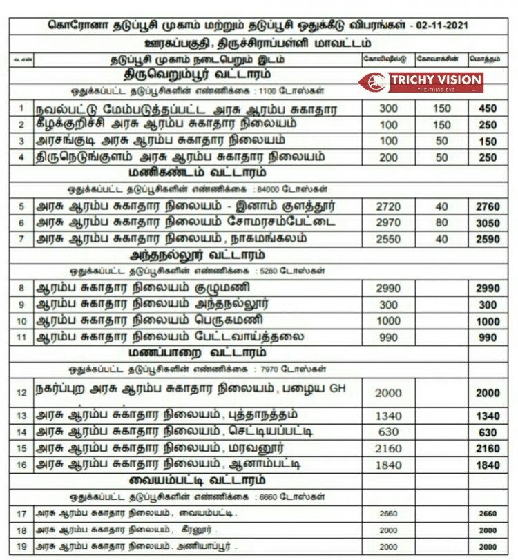 திருச்சி மாவட்டத்தில் நாளை (02.11.2021) கோவிசீல்டு, கோவாக்சின் தடுப்பு ஊசிகள் போடப்படும் இடங்களை மாவட்ட நிர்வாகம் அறிவித்துள்ளது.